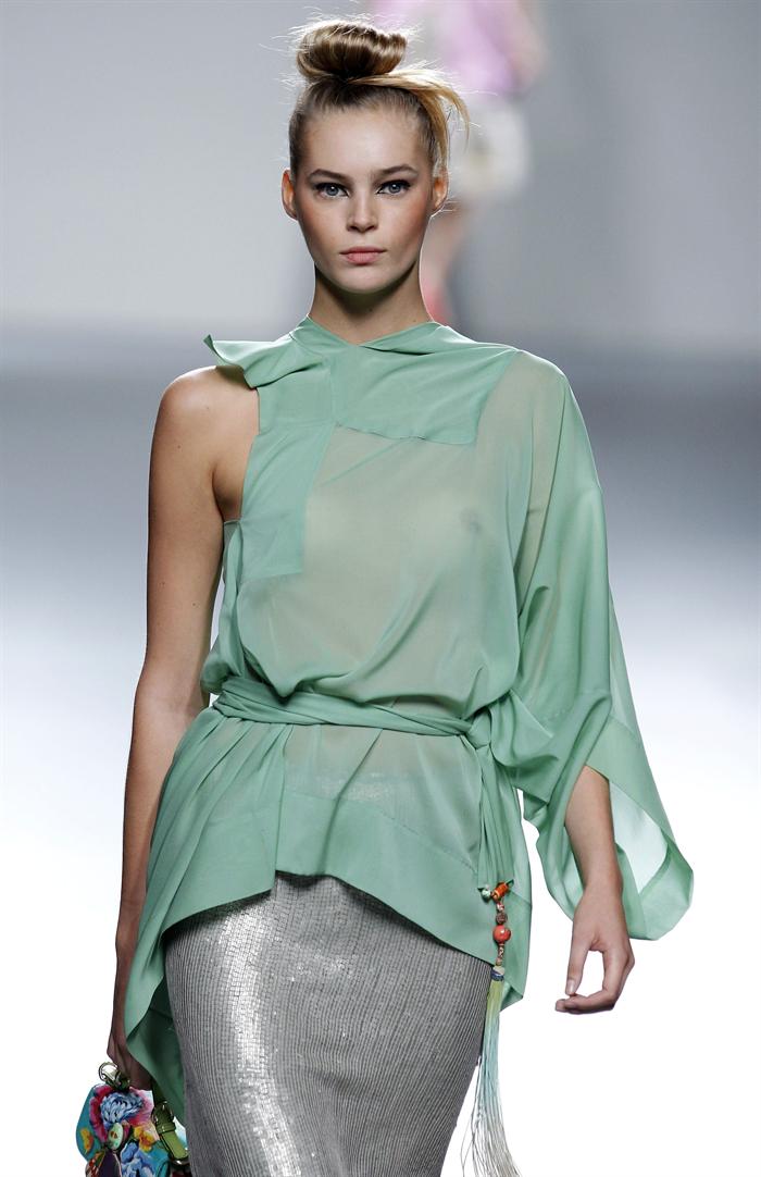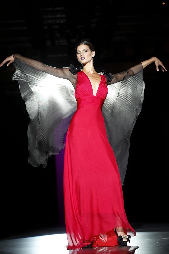 Uno de los modelos que Hannibal Laguna ha presentado esta tarde en la pasarela Fashionweek Madrid. El volumen, los vuelos y la doble capa de tela, que realzan la figura femenina, han estado presentes en la colección del diseñador venezolano