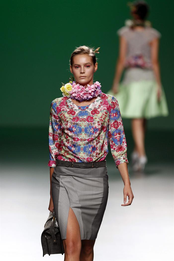 Uno de los modelos de la colección para la Primavera-Verano 2013 de la firma Devota & Lomba. El diseñador se inspira en el campo y el asfalto de su Vitoria-Gasteiz para crear esta colección, en la que predominan los estampados florales y el gris, tono utilizado tanto para el hombre como para la mujer