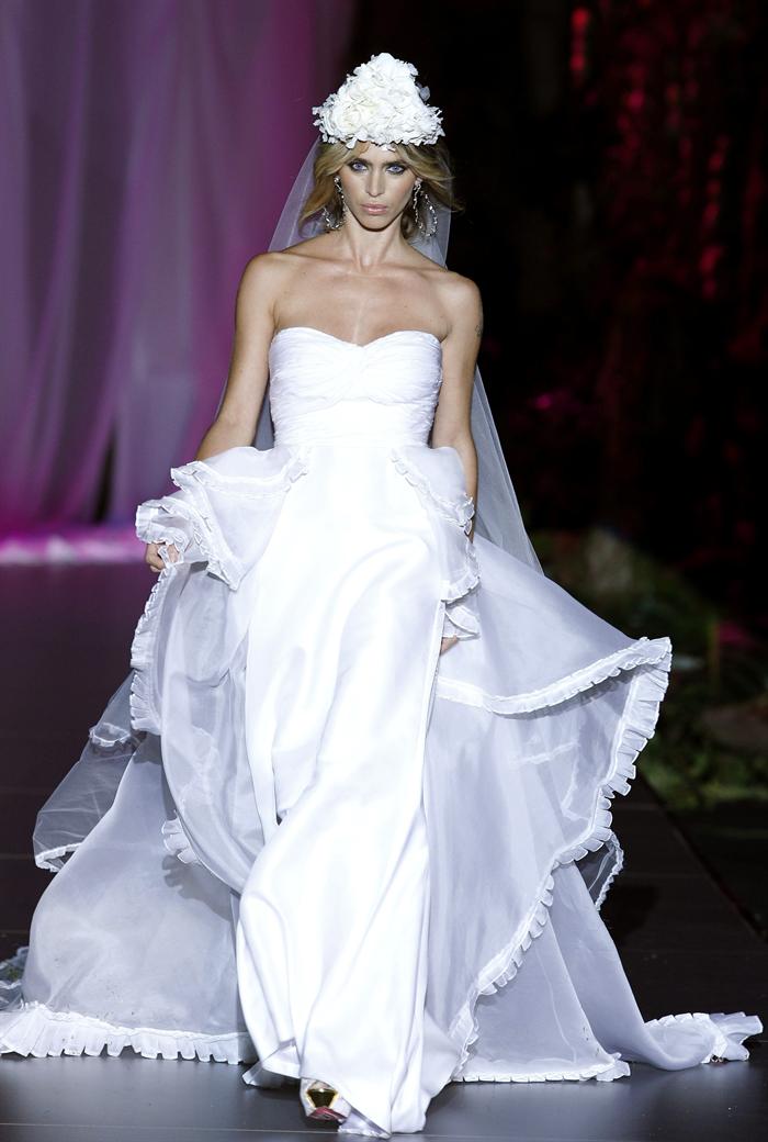 Modelo de novia con bordados de flores sobre gasa, una de las creaciones de la colección "Jardín español" del diseñador valenciano Francis Montesinos, presentada en la segunda jornada de la 56 edición de la FashionWeek Madrid