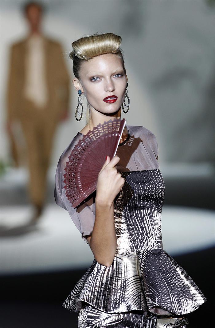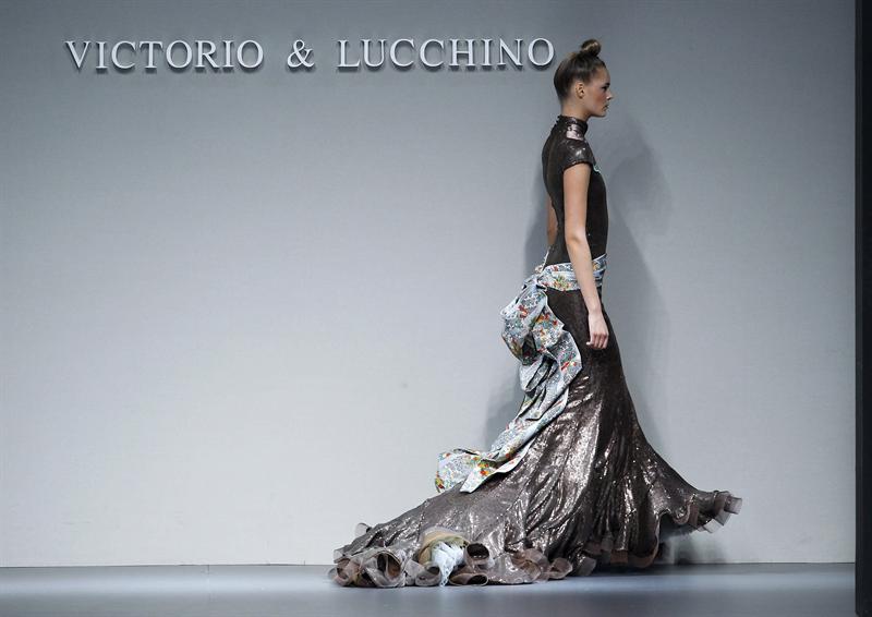 En el primer centenario del vestido tradicional chino, Qipao, los diseñadores Victorio&Lucchino han decidido que sea el punto de partida para crear su colección primavera-verano 2013, con unas propuestas que "van a crear tendencia", según han explicado hoy a EFEstilo los sevillanos. Con el único fin de reivindicar su personal sello y sus raíces andaluzas, los diseñadores pusieron punto y final al desfile con una vestido bata de cola repleto de "pailletes" (en la foto) adornado con una vistosa lazada estampada con motivos chinos. EFE/Chema Moya