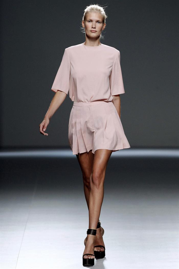 Falda en tono rosa, ceñida a la cintura, uno de los modelos de Ángel Schlesser, que ha animado esta tarde la pasarela Fashionweek Madrid con una colección "gráfica" en la que las rayas y los lunares se visten principalmente con los colores básicos, el blanco y el negro, para buscar unos diseños frescos y fáciles