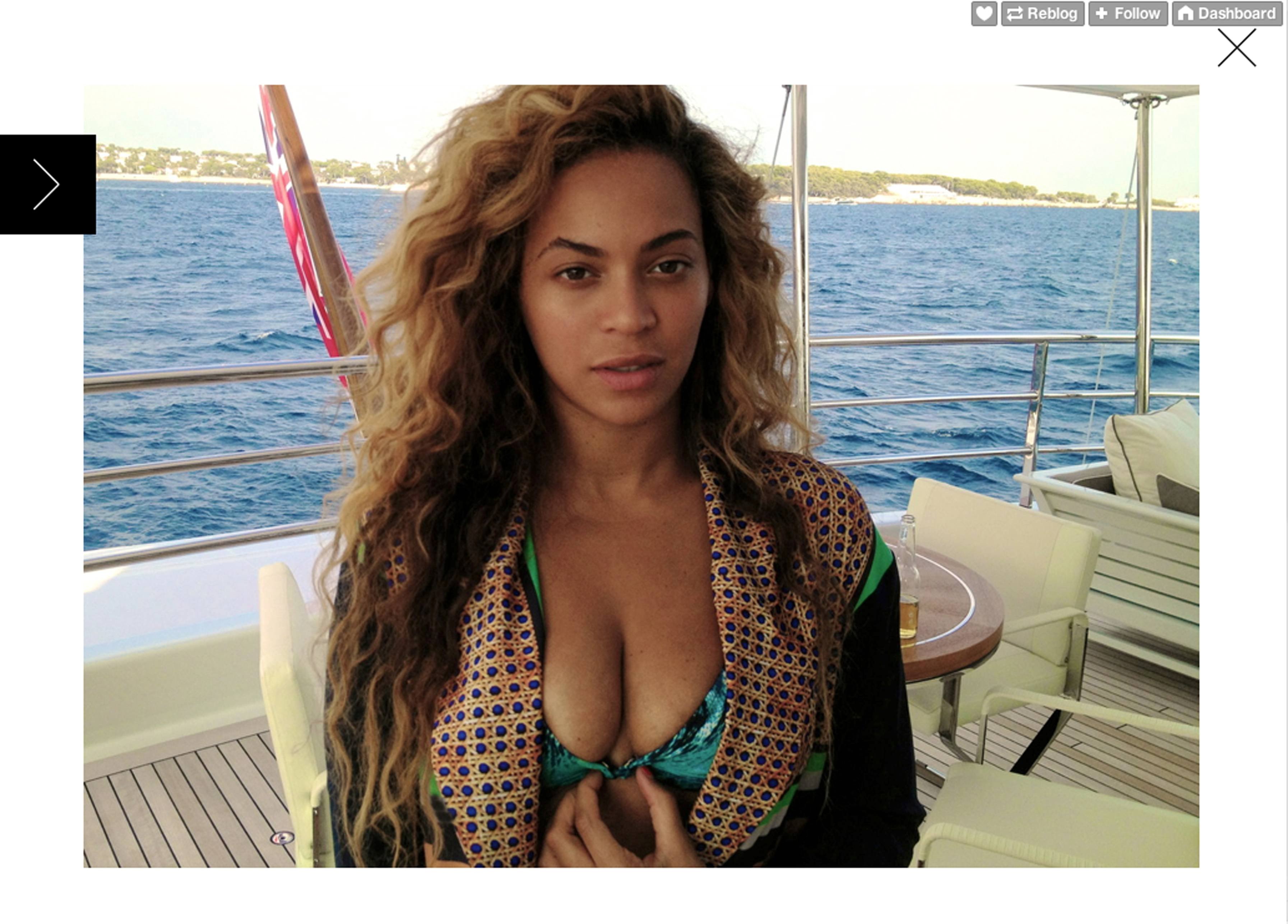 Beyoncé celebró su 31 cumpleaños en el mar. Sus vacaciones en el sur de Francia transcurrieron el pasado mes de septiemre, y la cantante compartió las imágenes por Tumblr. En la imagen, igual de espectacular sin maquillaje que antes de cantar.