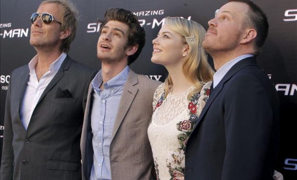 Con Rhys Ifans, Andrew Garfield y el director Marc Webb en el preestreno de The amazing Spider-Man en Madrid.