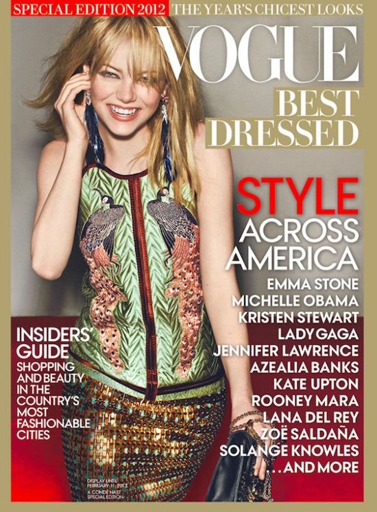 Emma Stone ha sido coronada como la mejor vestida de 2012 según Vogue. Este número especial lo han titulado Style Across America y recogen los mejores estilismos de las diez mujeres estadounidenses. Siguen a Emma Stone la también actriz Rooney Mara, Kristen Stewart, Zoe Saldana, la socialité Lauren Santo Domingo, la hermana de la conocidísima Beyoncé o la modelo Dree Hemingway.