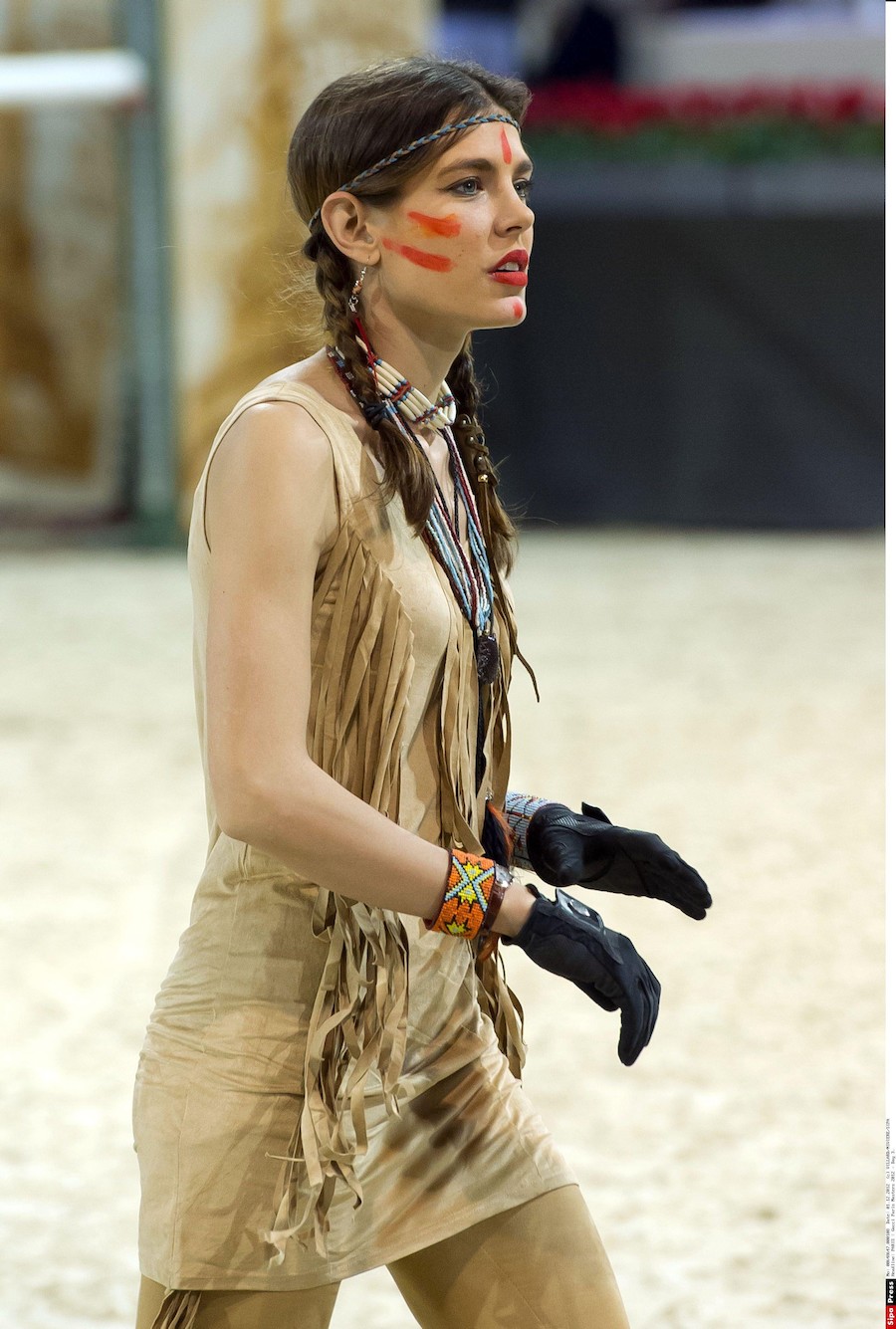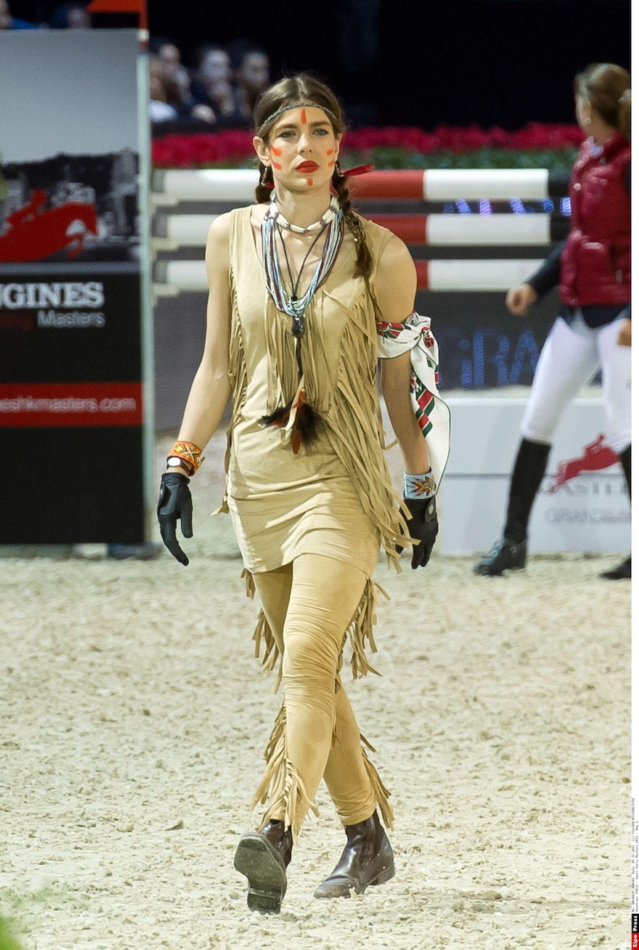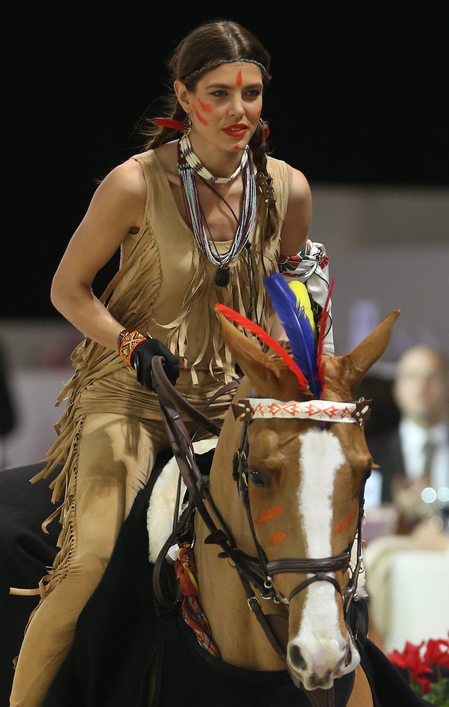 en una de las pruebas, los participantes tenían que competir luciendo un disfraz y Carlota Casiraghi, que es imagen de Gucci –recientemente estuvo en Madrid representando esa marca- eligió ser india por un día. Su salida a lomos de su caballo Carryduff Z (que también llevaba algunas plumas) fue triunfal y Carlota disfrutó como una niña.