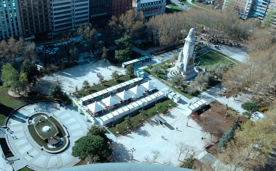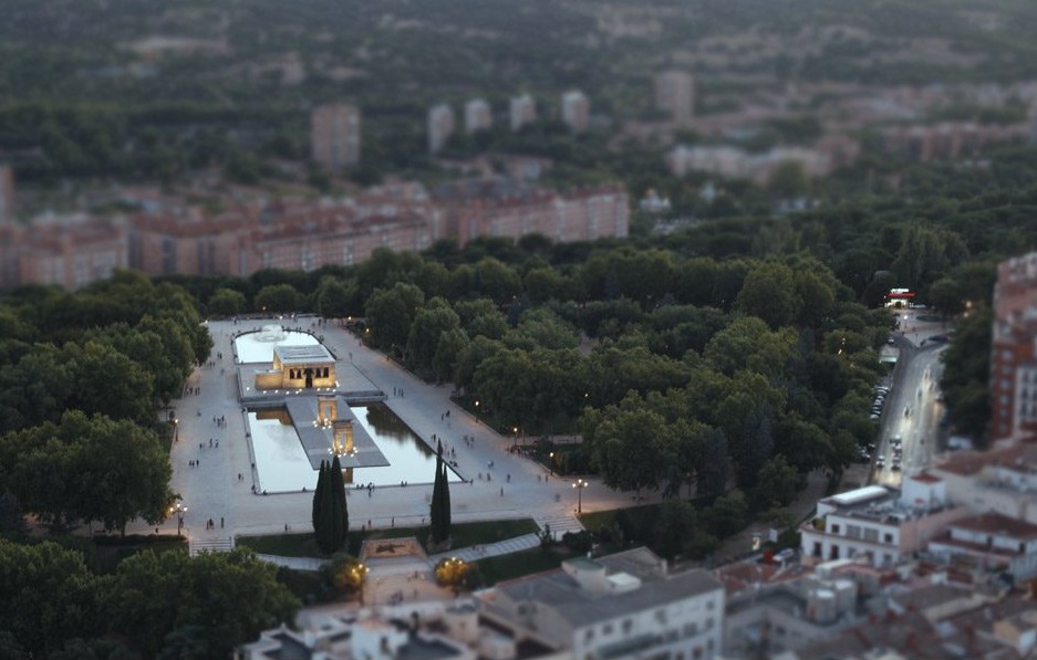 El templo de Debod, visto desde Torre Madrid, que se alza más de 140 metros sobre el suelo.