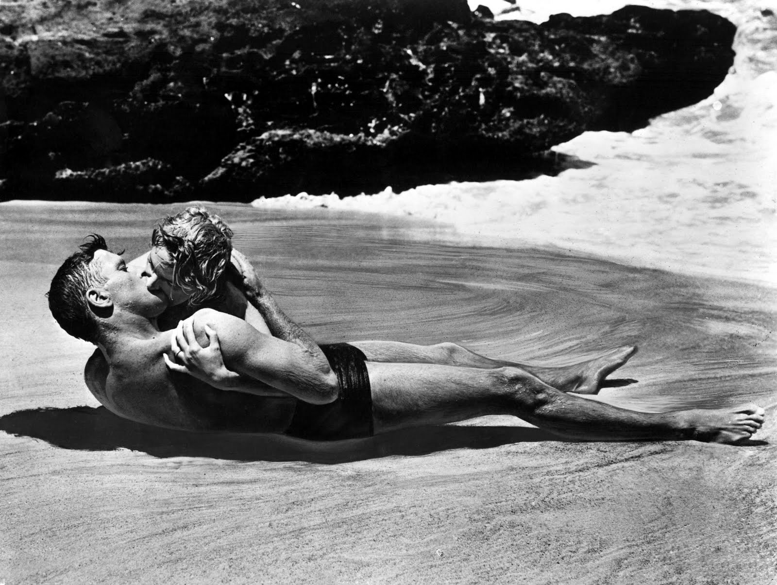 Si hubiera que citar un beso en la playa sería el prohibido -y polémico- visto en De aquí a la eternidad. En la imagen, Deborah Kerr y Burt Lancaster bien rebozados en la arena.