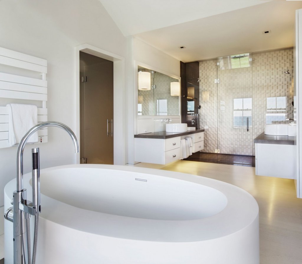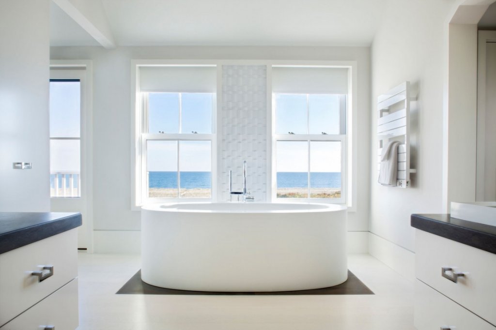 Los baños, decorados con un estilo minimalista, disponen de vistas al mar.