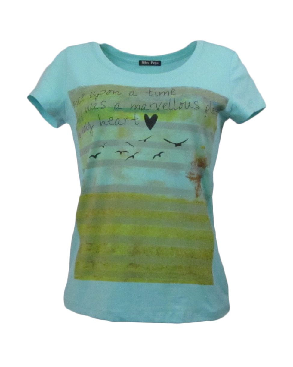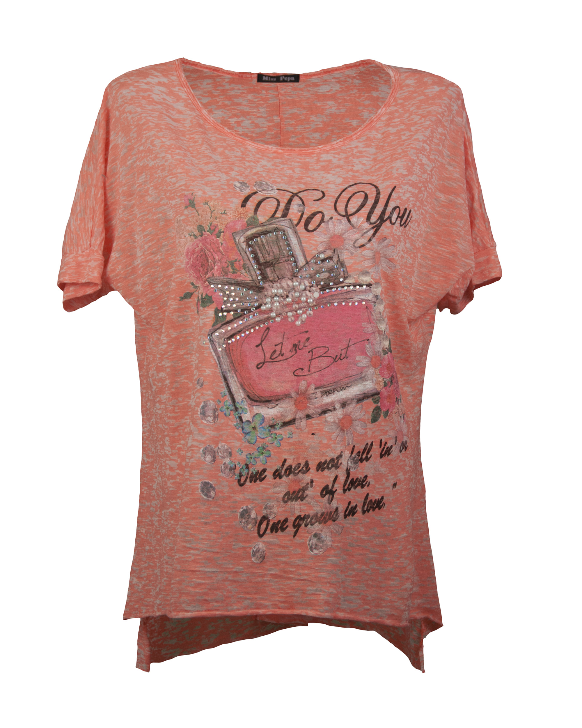 Bonita camiseta con estampado en su cara delantera. El bajo asimétrico le da el toque divertido.