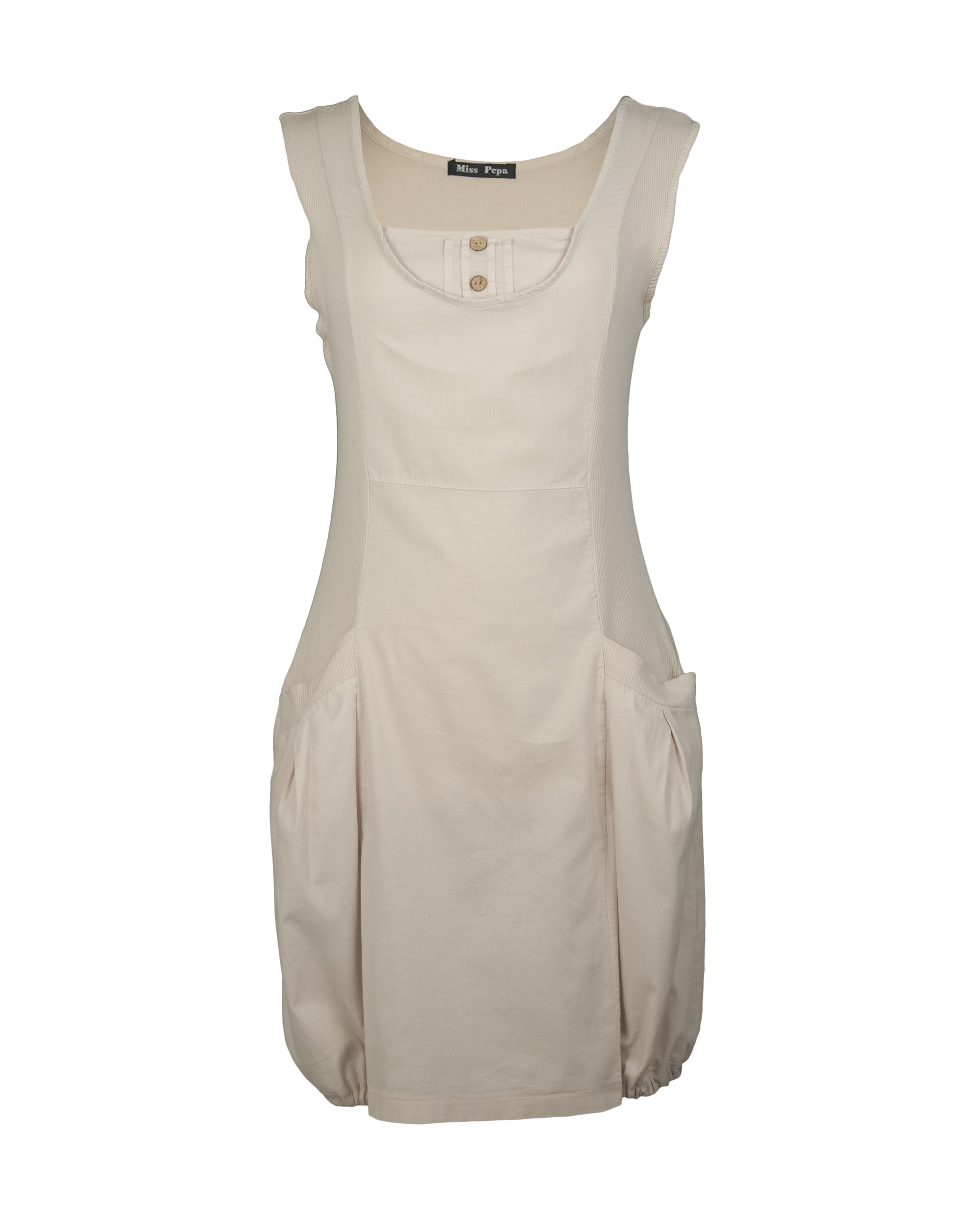 Este original vestido es fruto de la combinación de dos tejidos, canalé y liso, y además tiene dos grandes y originales vestidos para hacerlo más práctico, ya sea en el campo o en la playa.
