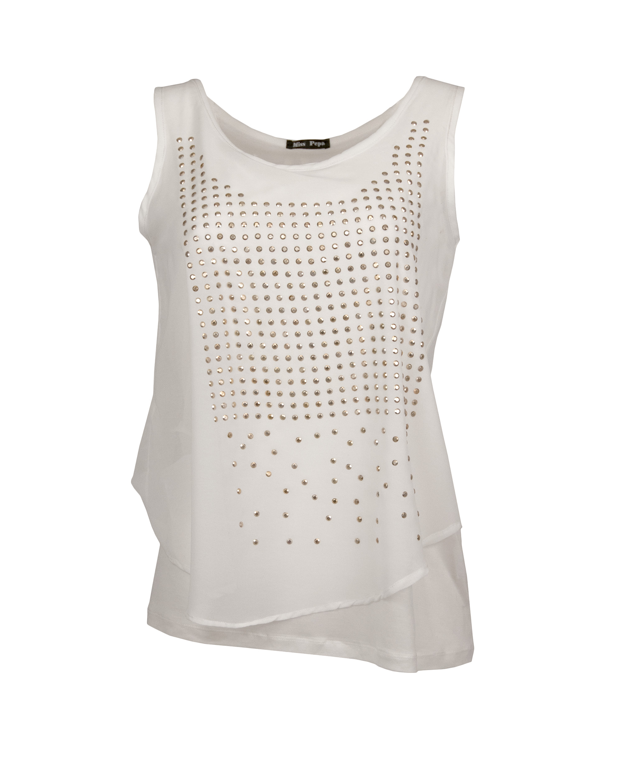 El blanco tiene que ser un referente en tu armario. Desprende luz y permite combinarlo con todo tipo de colores. Esta camiseta con lentejuelas y tirantes es un básico imprescindible.