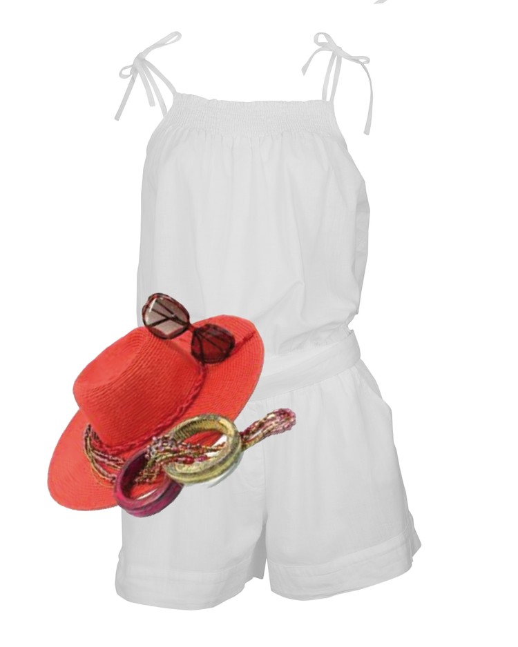 Si pasas de vestidos el mono te permite ser más original y a la vez crear el mismo efecto. Un sombrero aporta el toque luminoso, y todos los demás avalorios quedan perfectos con el color blanco. El mono es de Miss Pepa.