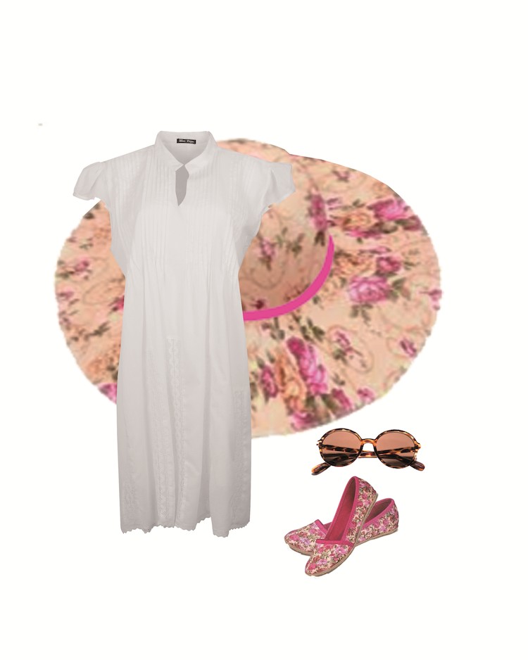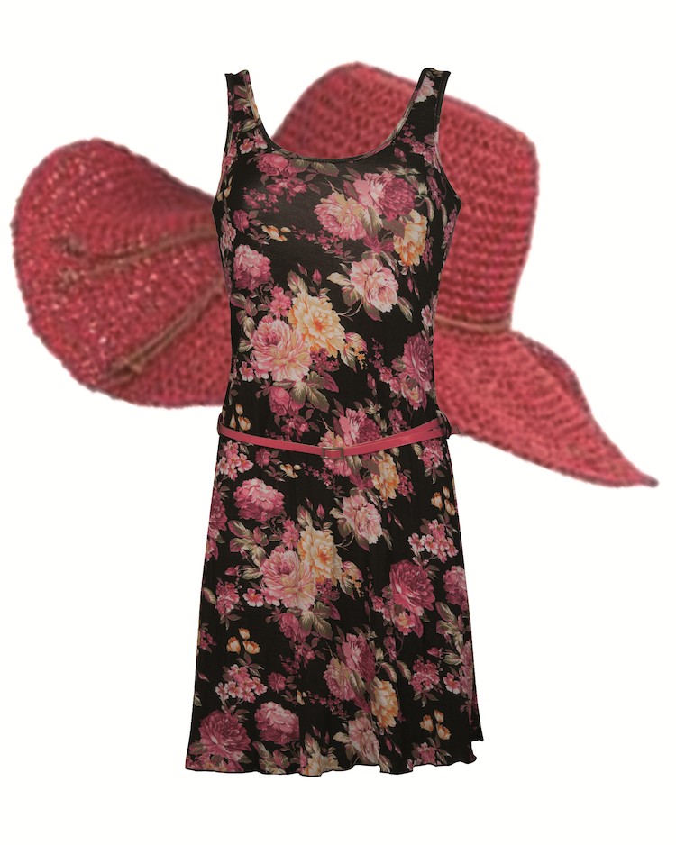 Un vestido estampado con cinturón de polipiel queda de maravilla con una pamela para protegerte del calor.
