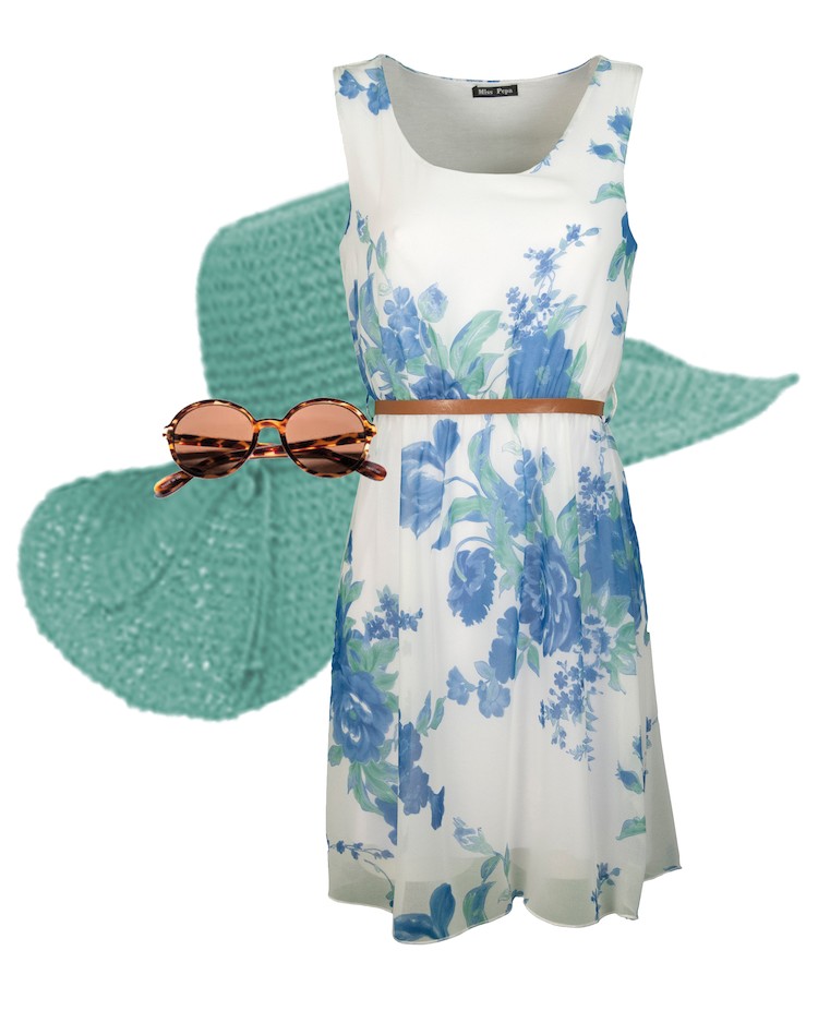 Este elegante y clásico vestido floral se ciñe al cuerpo a la vez que deja a la imaginación funcionar. El sobrero a juego y las gafas de sol añaden el toque final.