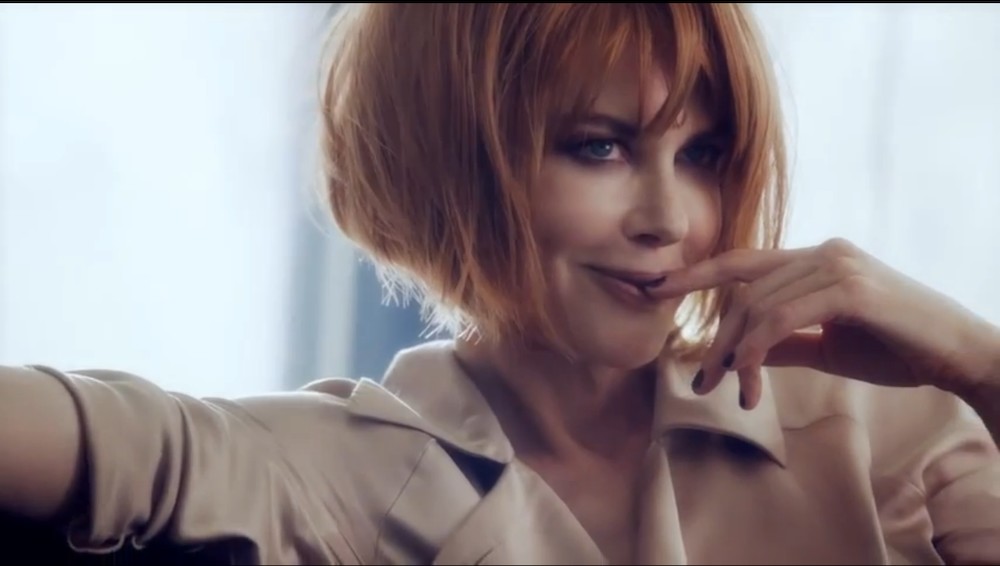 Luce una sorprendente melena corta pelirroja. Se convierte en una femme fatal, misteriosa y sexy. Lleva en el anuncio bolsos, zapatos y prendas de la marca. Además, seduce a la cámara con su mirada. Con este vídeo se puede ver que los años no pasan por ella.