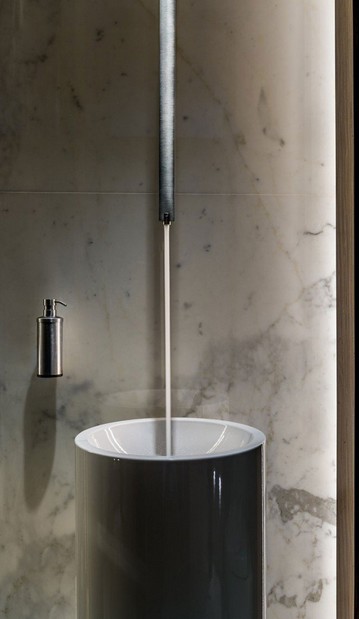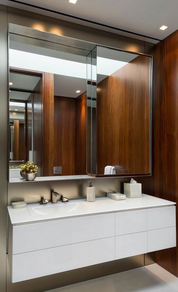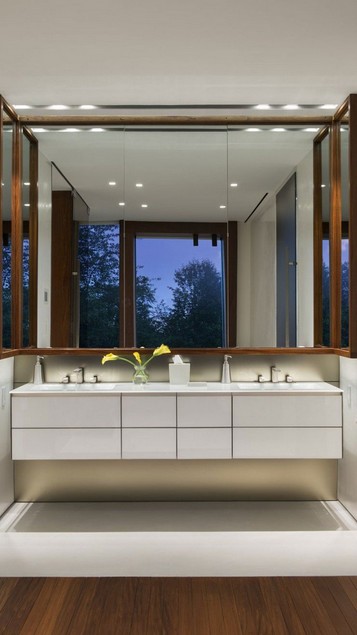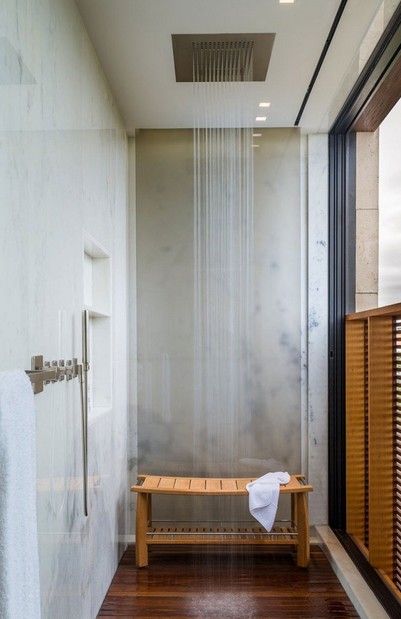 Una imagen de la ducha, que vuelve a combinar madera y mármol en un estilo sobrio pero moderno.