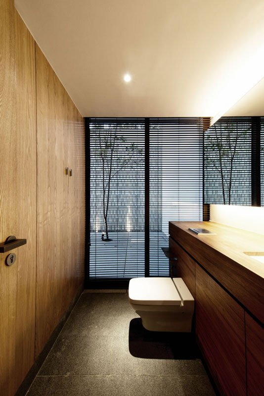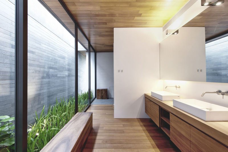 Una vista del baño, con tanto mármol como madera, y a la vez un muro que permite mantener la privacidad.