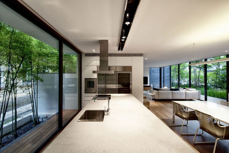 Wall House, que así se llama, está rodeada de exuberante vegetación con árboles de todo tipo.