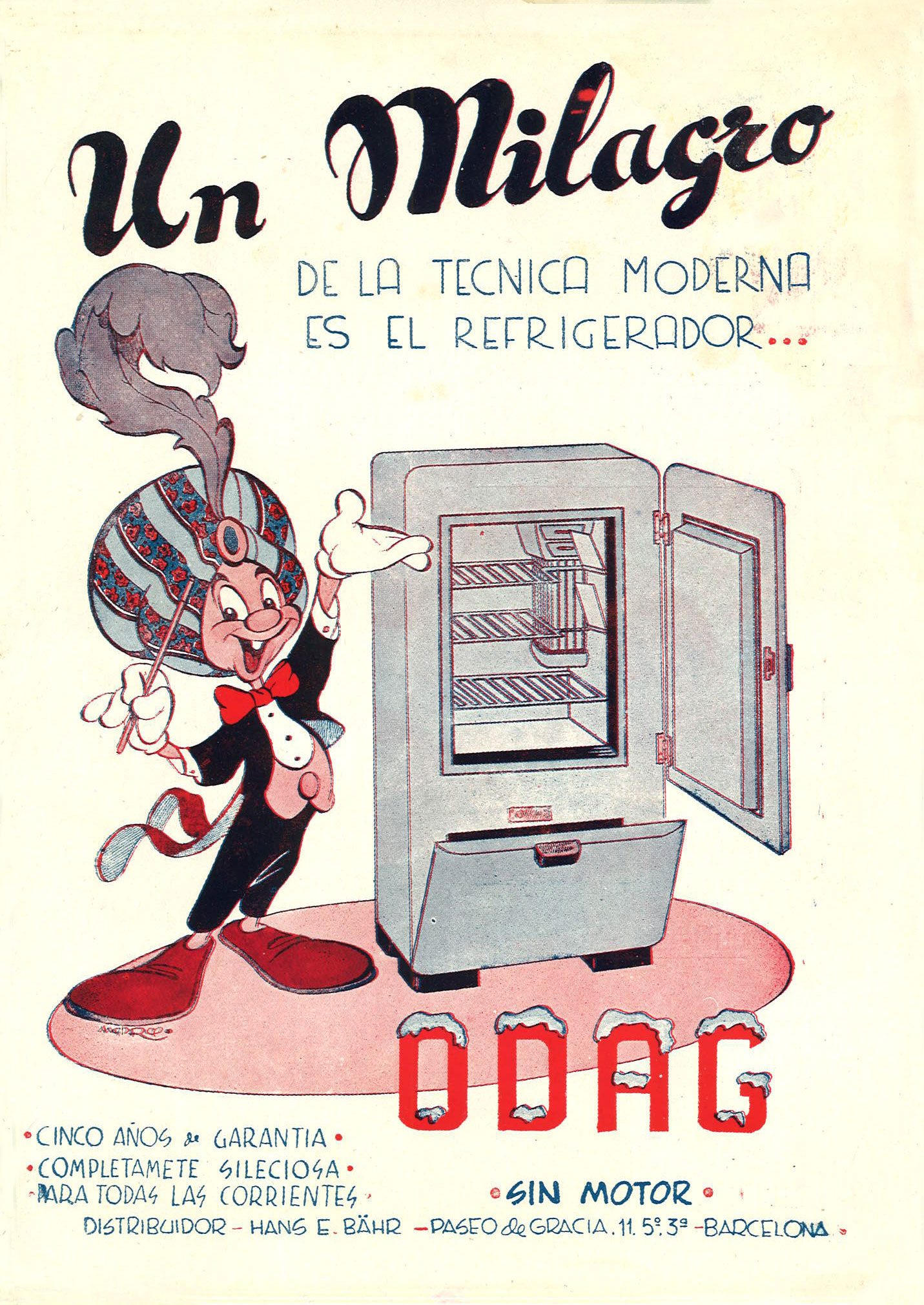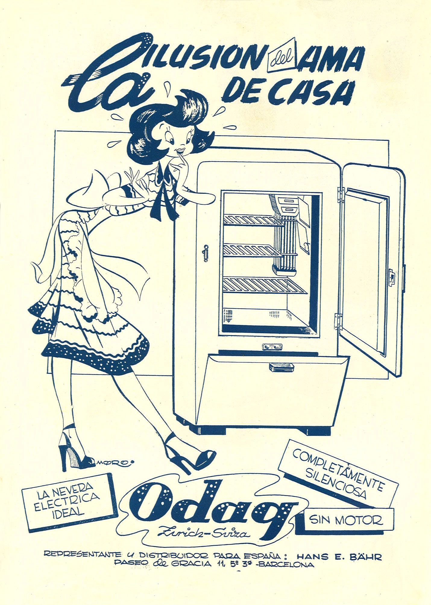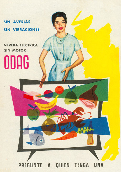 Esta anuncio tan colorista como figurativo permite soñar con una maravillosa nevera Odag fabricada con licencia suiza sin motor. (Ver anuncios "Cha-Cha-Cah" y “Viva mejor” de Estudios Moro)