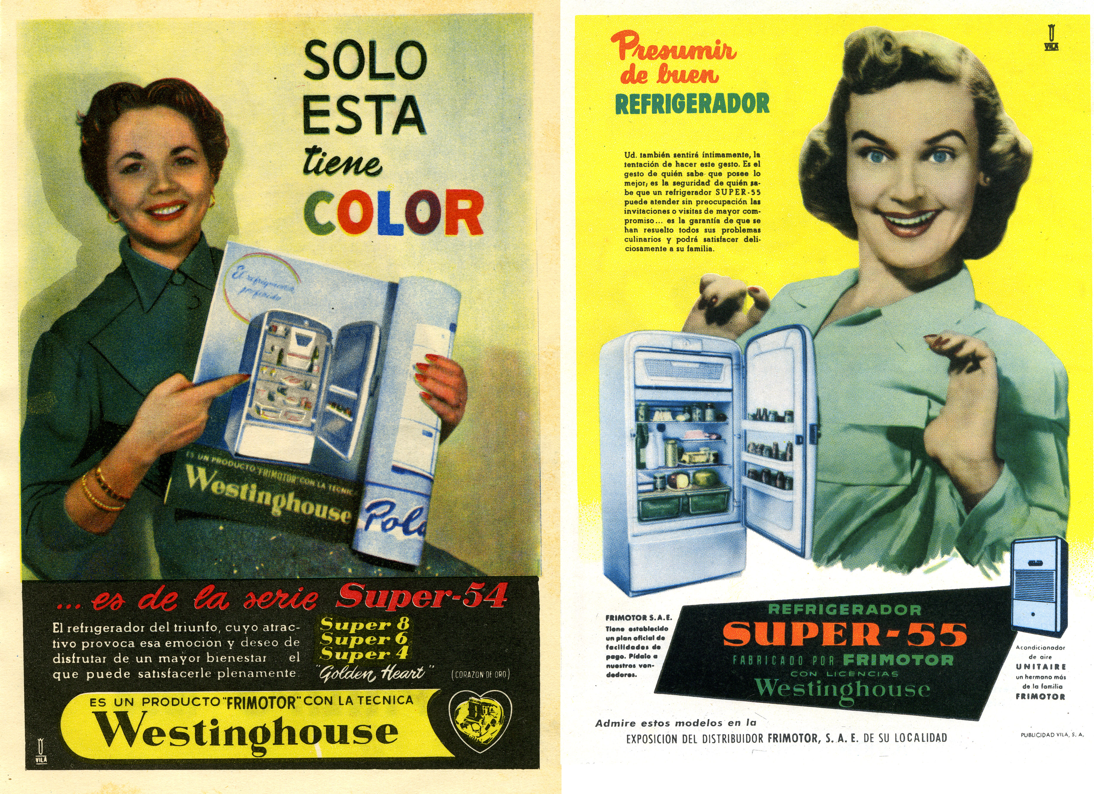 Uno de los primeras neveras fabricadas por Frimotor para la firma norteamericana Westinghouse. Los anuncios son de 1954 y 1955. (Ver anuncios "Cha-Cha-Cah" y “Viva mejor” de Estudios Moro)