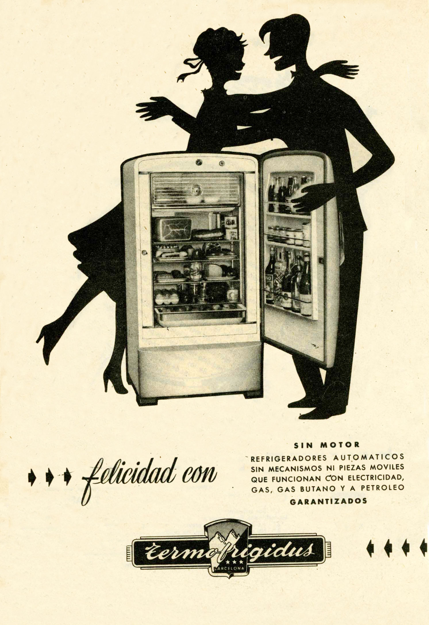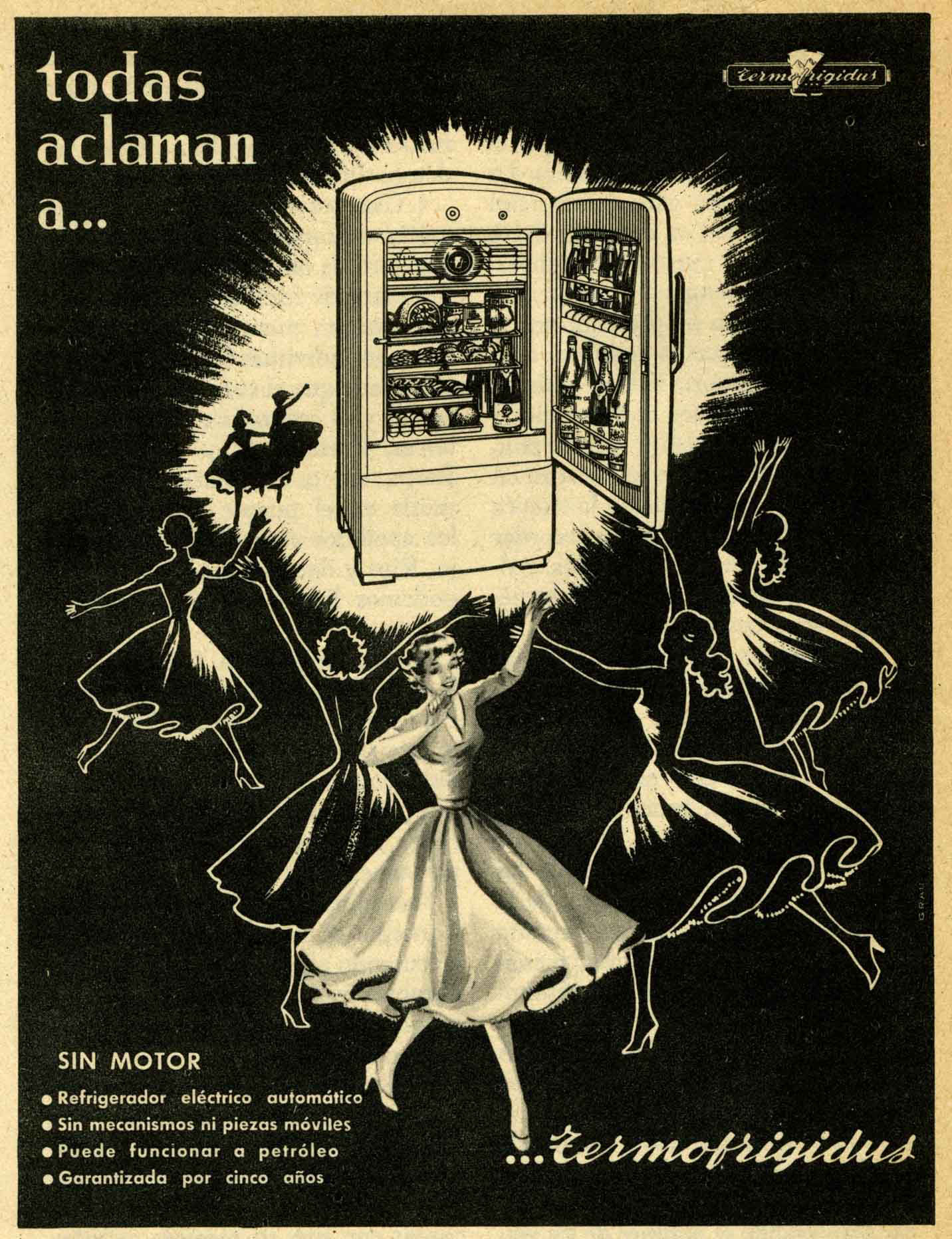 Antiguo anuncio de Termofrigidus en el que las mujeres saludan la llegada de esta nevera sin motor como si fuera un Tótem de la modernidad. (Ver anuncios "Cha-Cha-Cah" y “Viva mejor” de Estudios Moro)