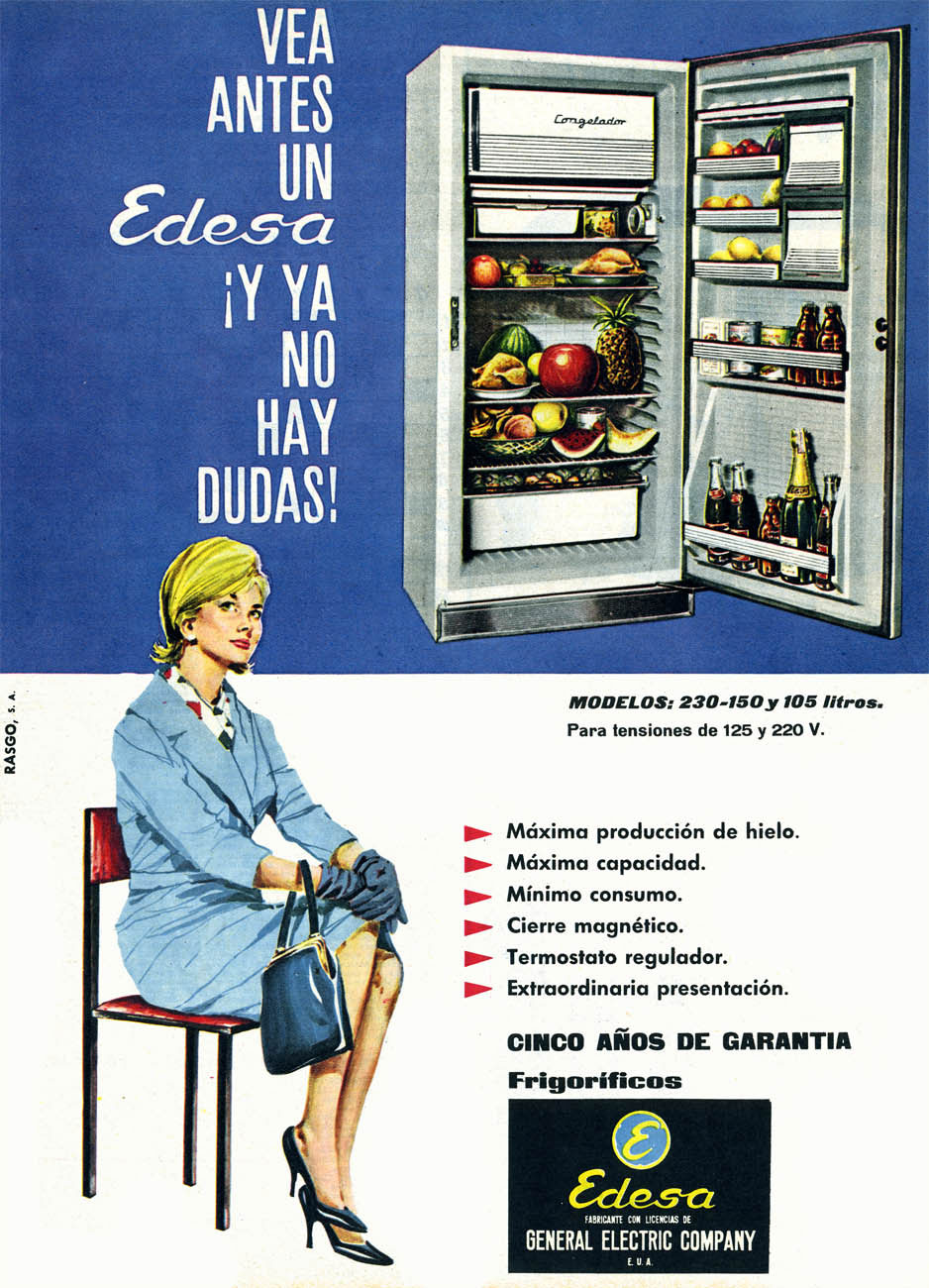 La General Elecric Company compitió con las otras marcas de neveras norteamericanas con su marca española Edesa. (Ver anuncios "Cha-Cha-Cah" y "Viva mejor" de Estudios Moro)