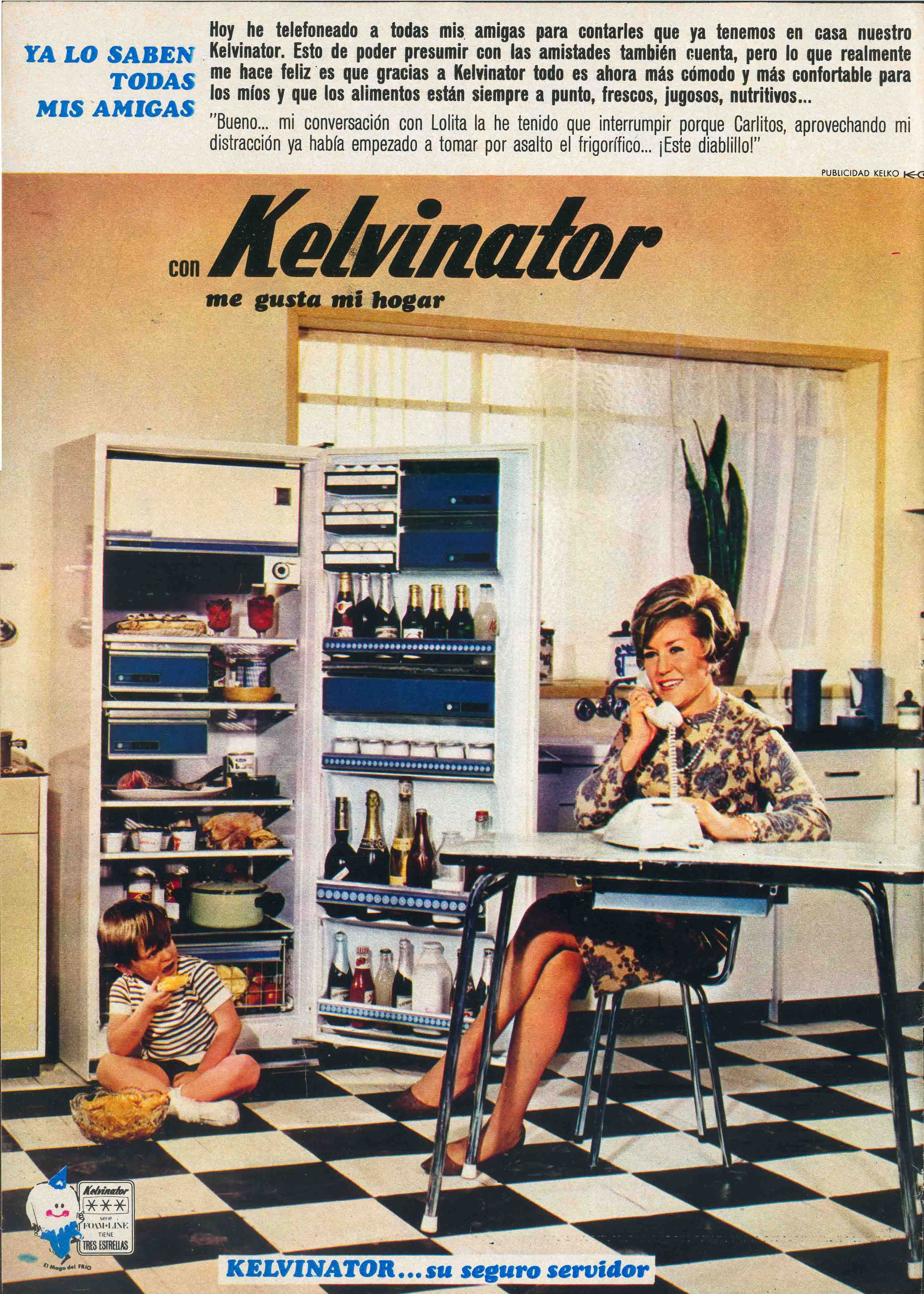 El ama de casa moderna, además de una cocina en la que el niño podía comer sopas en el suelo, gozaba lo suyo llamando a las amigas para contarles las maravillas de su nuevo Kelvinator. En 1967, los tiempos de bonanza ya se notaban. (Ver anuncios "Cha-Cha-Cah" y “Viva mejor” de Estudios Moro)