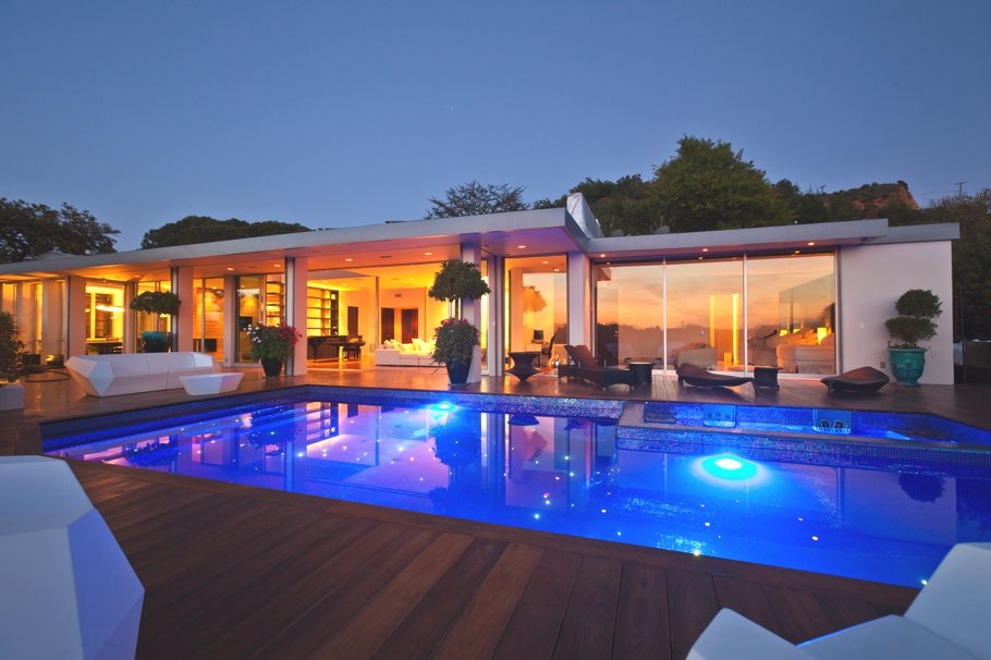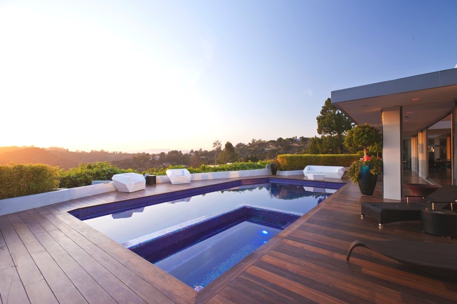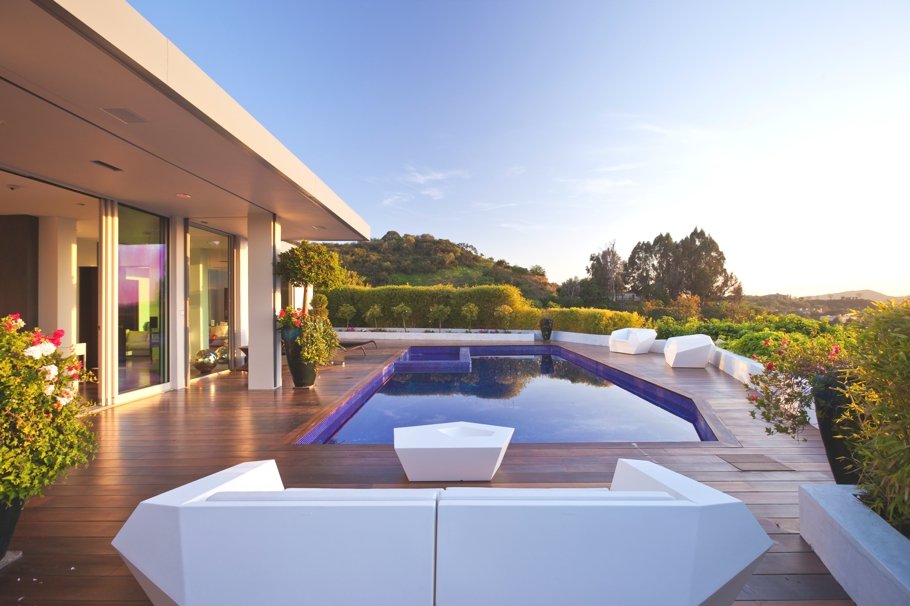 Otra imagen del patio con piscina, con las colinas de Beverly Hills al anochecer. Precisamente la piscina también ha jugado un papel muy importante en la reconfiguración de esta casa de una sola planta.