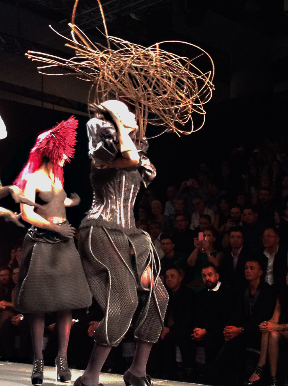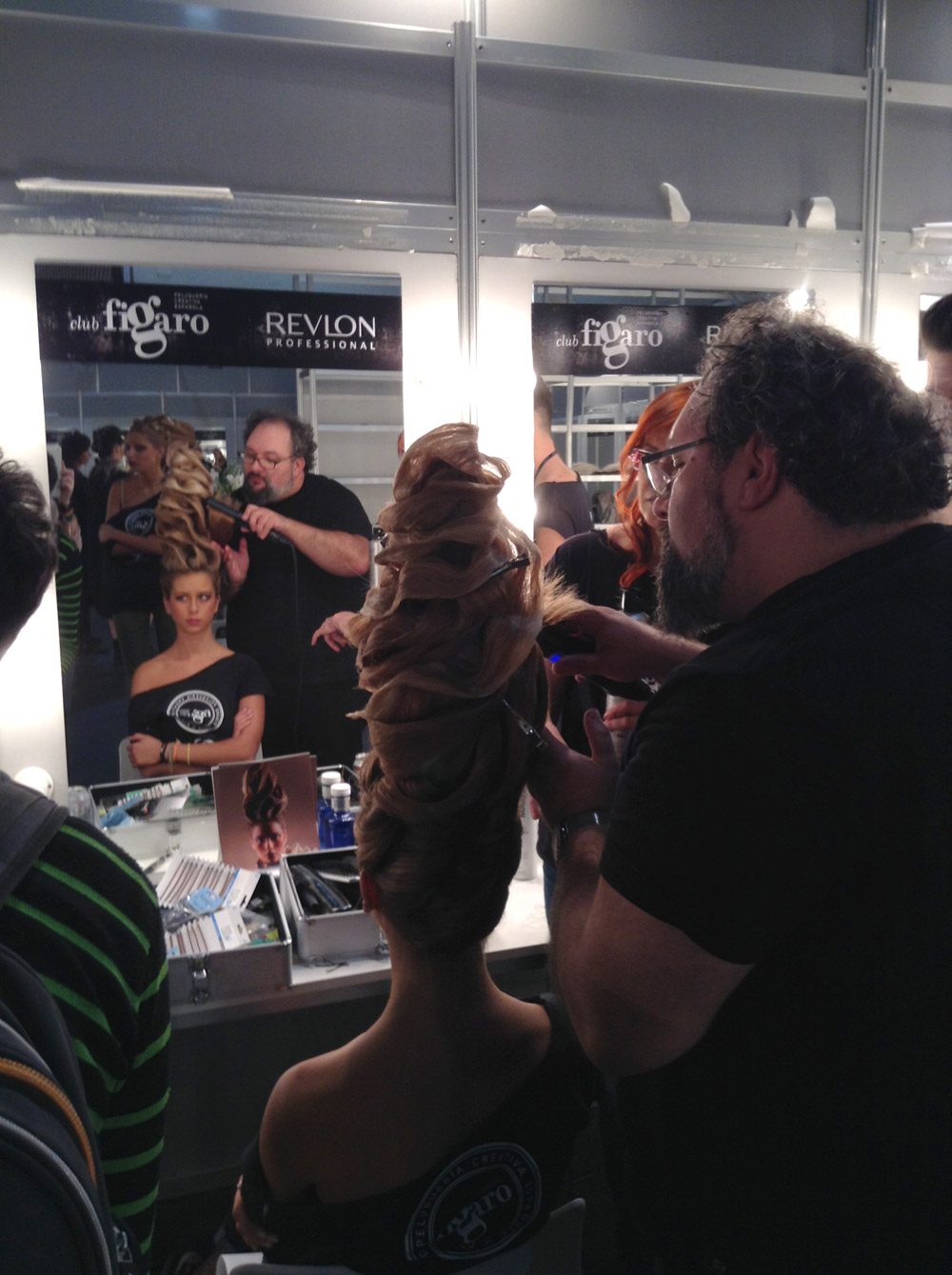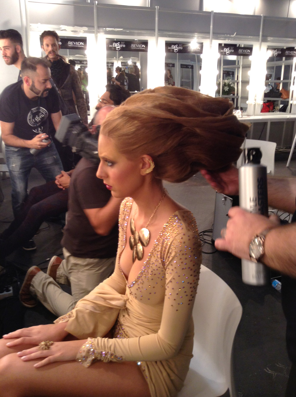 Algunos de los grandes peluqueros españoles se dedicaron a crear peinados como los que podemos ver en estas imágenes, tomadas en la trastienda del evento. El evento sirvió de plataforma para que profesionales como Óscar G. plasmaran ideas como éstas.