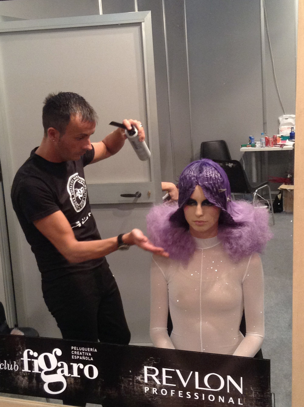 Otra imagen del backstage del concurso de peluquería creativo, con Manuel Mont trabajando en su coleccion de ninfa y crisalidas, y aportando la nota de color.