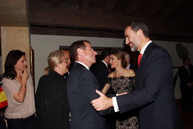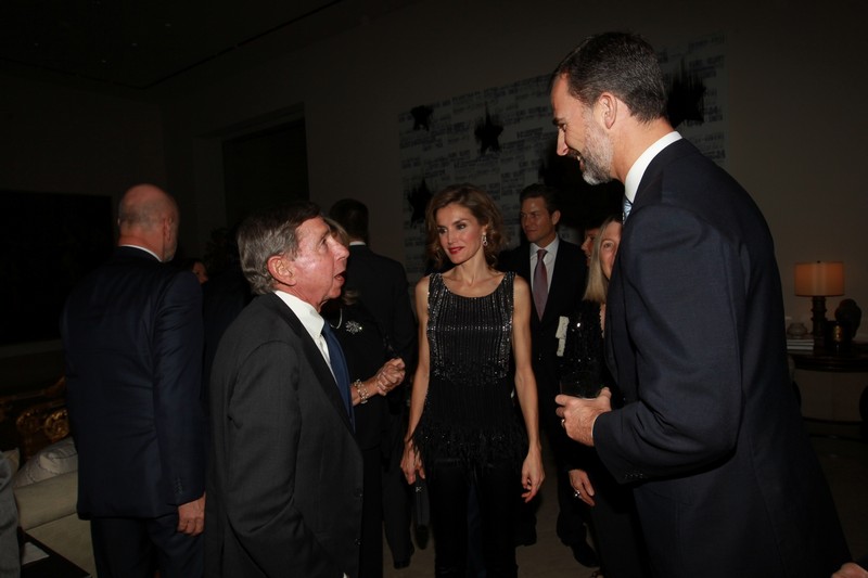 También han acudido a la residencia del embajador de EE.UU en España, James Costos. La princesa deslumbró esa noche con una camisa negra repleta de pedrería por la parte superior y de plumas por la zona inferior y de unos pantalones de raso. Además, se recogió la melena y se lo rizó.
