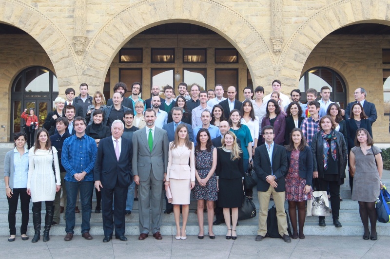 Otro de los lugares que visitaron los Príncipes de Asturias en su viaje a estados Unidos ha sido la Universidad de Stanford. En esta ocasión, la princesa Letizia escogió un traje de chaqueta de color rosa palo con un clutch del mismo tono que el vestido. De nuevo, llevaba la melena suelta.