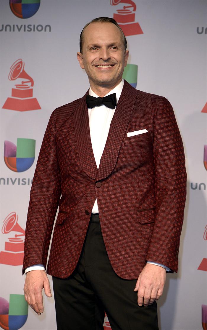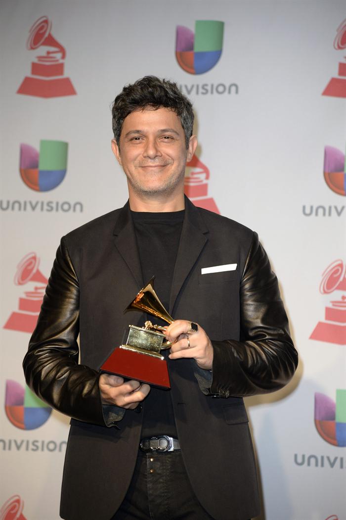 El cantante español Alejandro Sanz sostiene el premio Grammy a Mejor Álbum Vocal Pop Contemporáneo. Para la gala llevó un traje, sin embargo, luego posó con un look mucho más informal. Entero de negro, de vaqueros y con una original americana con las mangas de cuero.