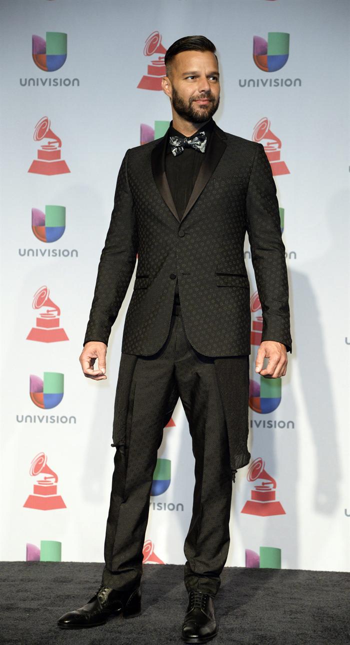 El cantante puertorriqueño Ricky Martin también acudió a los Premios Grammy Latinos 2013. Escogió un traje negro entero con un peculiar estampado.