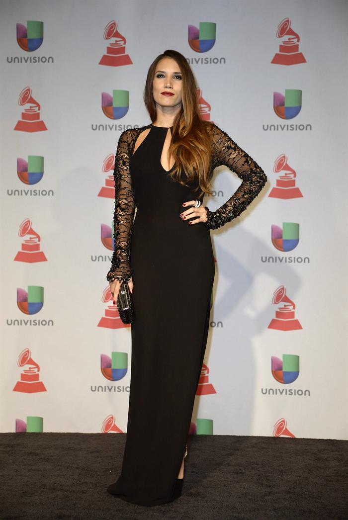 La actriz Cristina Bernal acudió a los Premios Grammy 2013 con un precioso vestido de encaje negro con la espalda al aire y de manga larga.