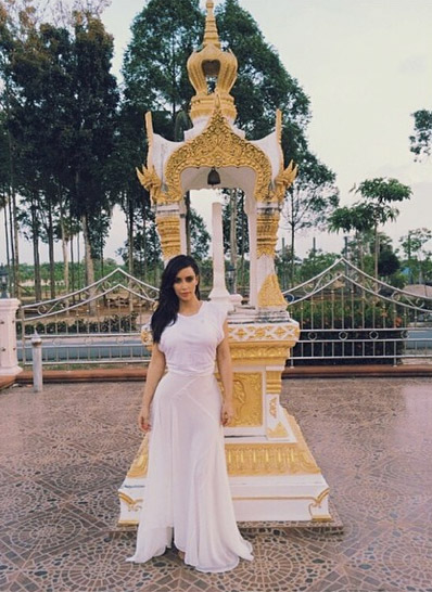 Kim, habitualmente desinhibida, también tuvo tiempo para cubrir su cuerpo y posar entre exóticos monumentos y escenarios.