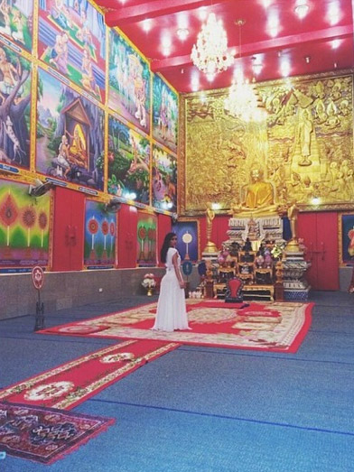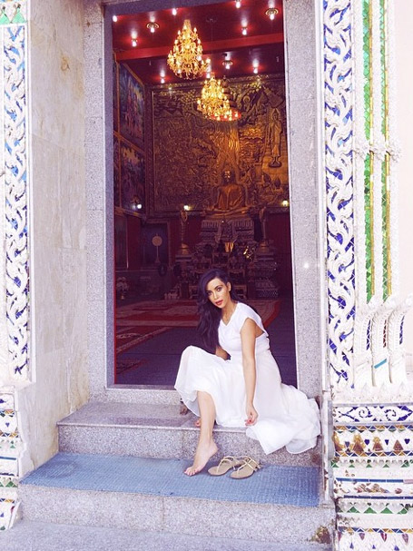 Con un bonito vestido blanco, Kim se quita las sandalias a la entrada de un templo.