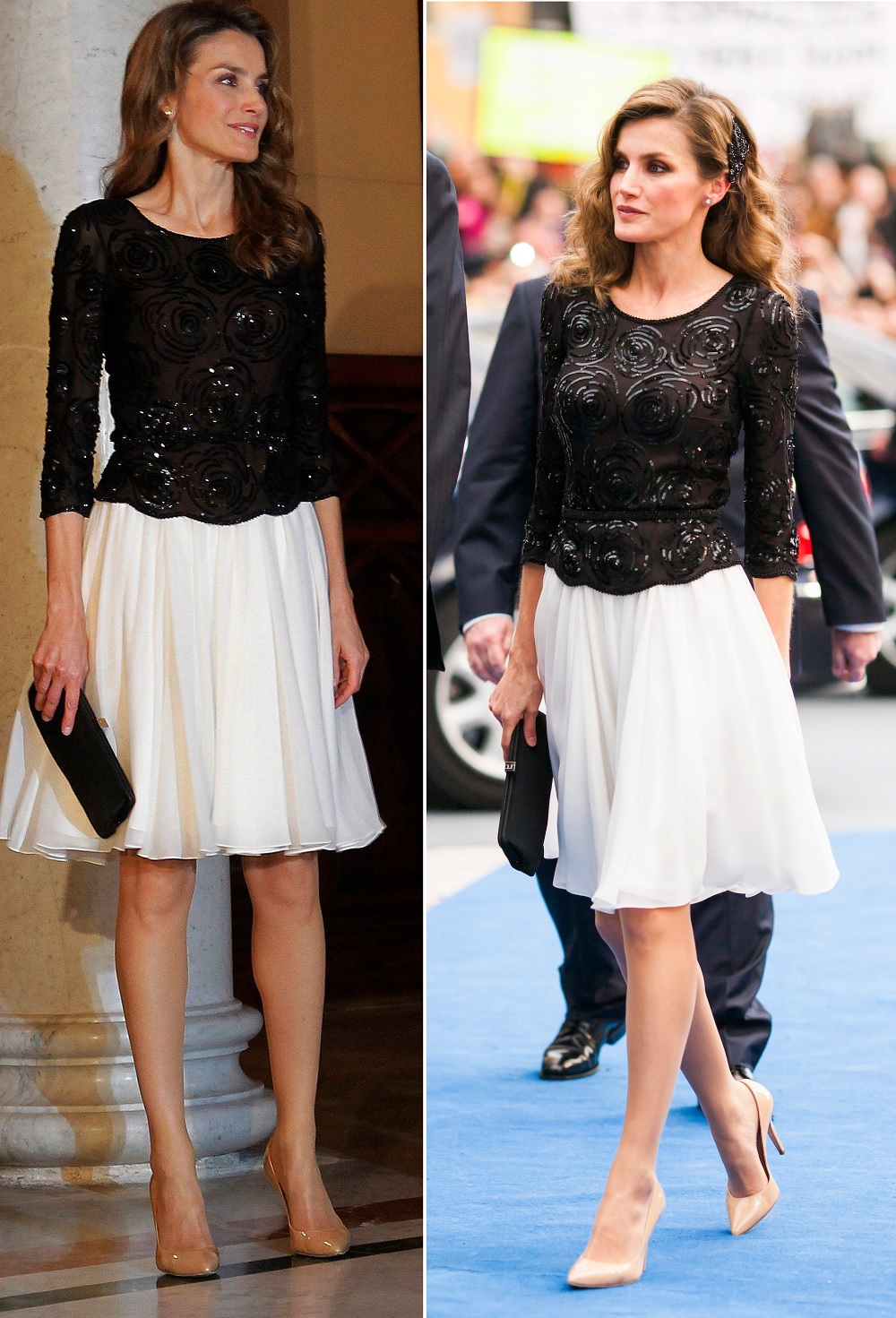 Elegante y estilizado conjunto de dos piezas y tacones. Dos de las ocasiones en las que Letizia lo eligió fue en el acto de ingreso en la Real Academia Española, el 8 de noviembre de 2013, y en la entrega de los Premios Príncipe de Asturias el 26 de octubre de 2012.