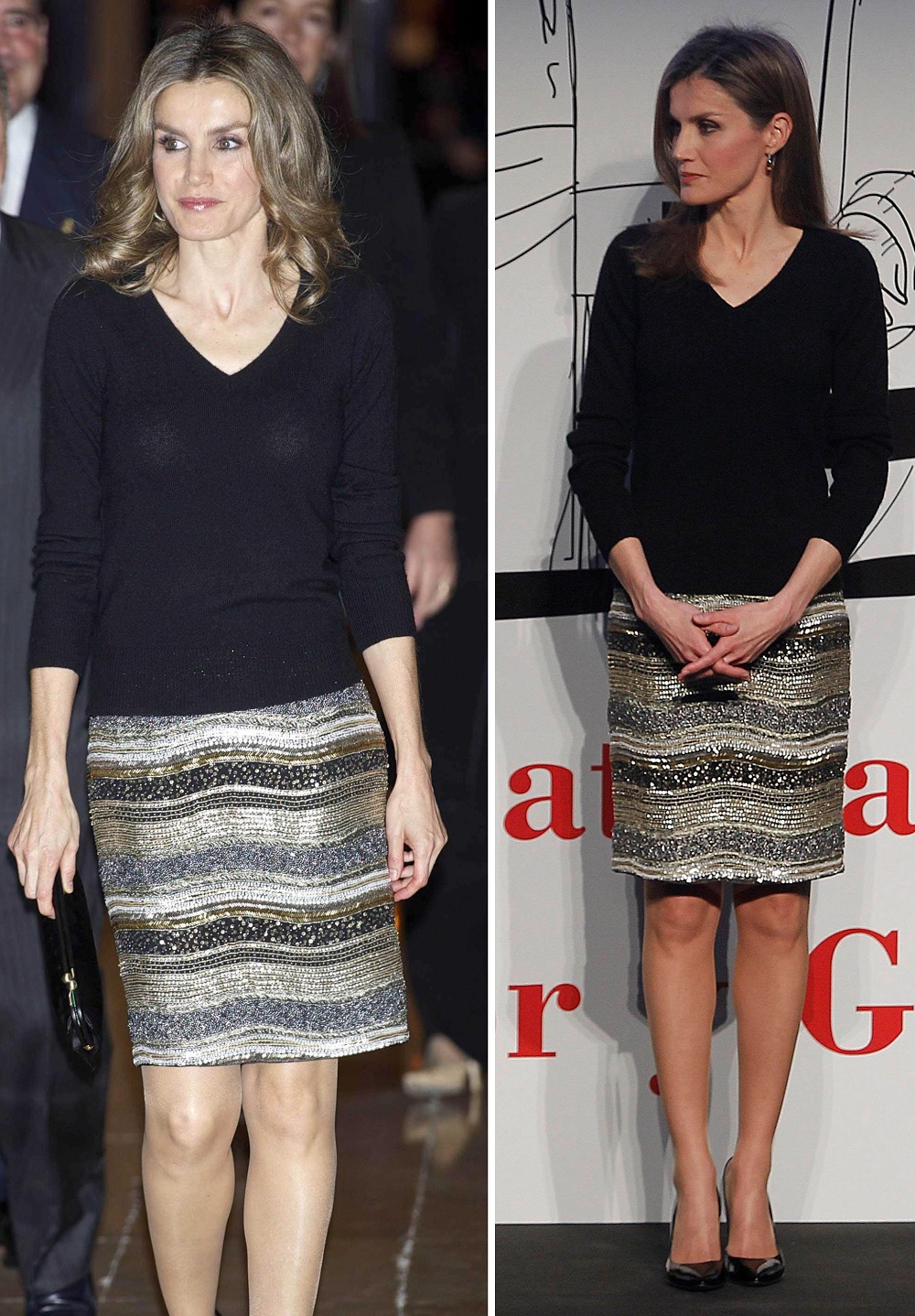Esta falda de paillettes es una de las que más ha repetido. Suele hacerlo con blusas blancas o jersey negro. Se le ha visto con ella en la entrega de los premios de literatura infantil y juvenil del Barco de Vapor y Gran Angular el 1 de abril de 2014 y durante un concierto en Oviedo hace más de dos años.