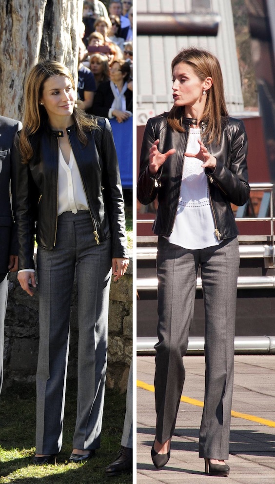 La princesa de Asturias se siente a gusto con traje de pantalón y cazadora. Este es uno de los modelitos más socorrido por Letizia. Por ejemplo, lo llevó cuando visitó el Centro Integrado de Formación Profesional y hace un año visitando un pueblo de Asturias.