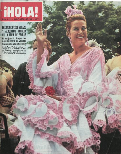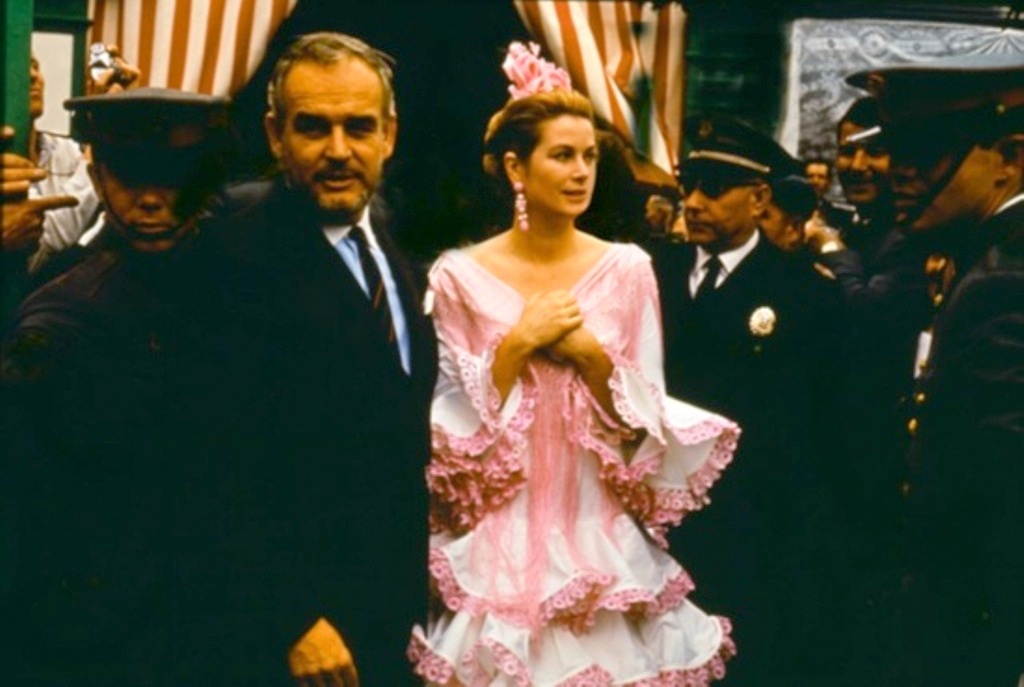 Grace, vestida por Lina, una de las grandes diseñadoras de trajes de gitana. A su lado el príncipe escoltándola entre las casetas.