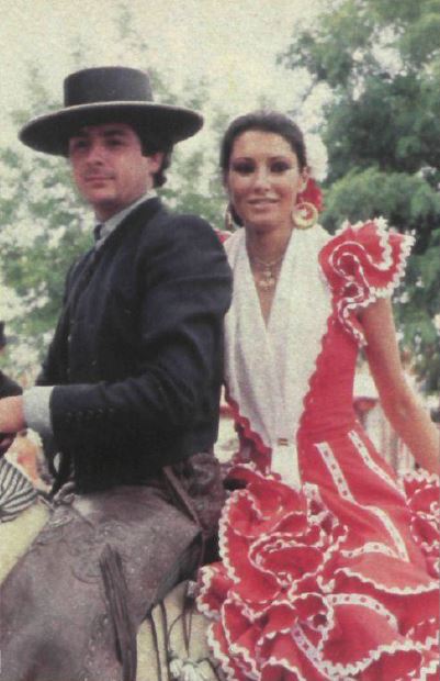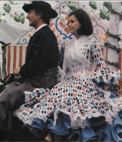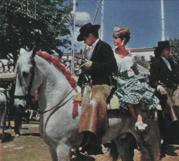 En 1965 Marisol y el torero Ángel Peralta estrenaban la película Cabriola. Así paseaban por la Feria, promoción y tradición. Si la dama va con traje de flamenca, siempre debe montar con las dos piernas hacia un lado.