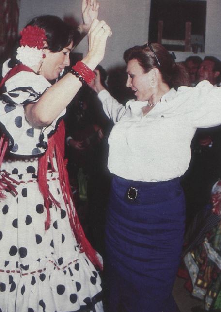 Mientras que Carmen Romero, la first lady que no quiso serlo, no escatima en detalles folclóricos, bien de flores y bisutería de plástico, Rocío Jurado decide ponerse sencilla con un conjunto de falda sport y camisa blanca.