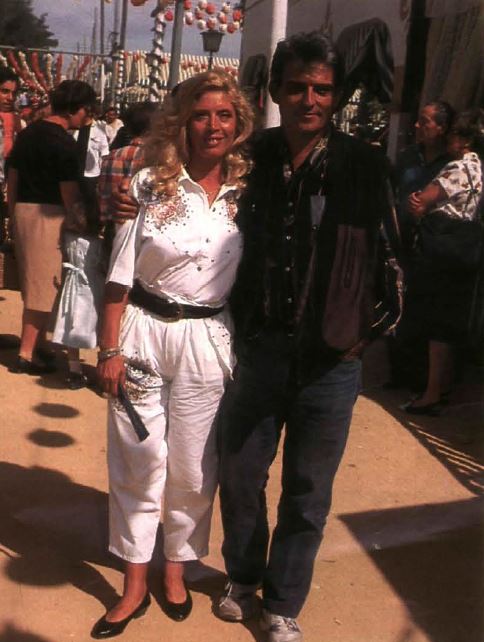 1987. Jaime Ostos y María de los Ángeles Grajal hacía apenas un mes que habían pasado por el juzgado para casarse. Tremendo calor el de la Feria. Gafas de sol para resguardarse. Aunque los sudores no había como aplacarlos, los brillos dan a la pareja un look un poquito House of Wax.