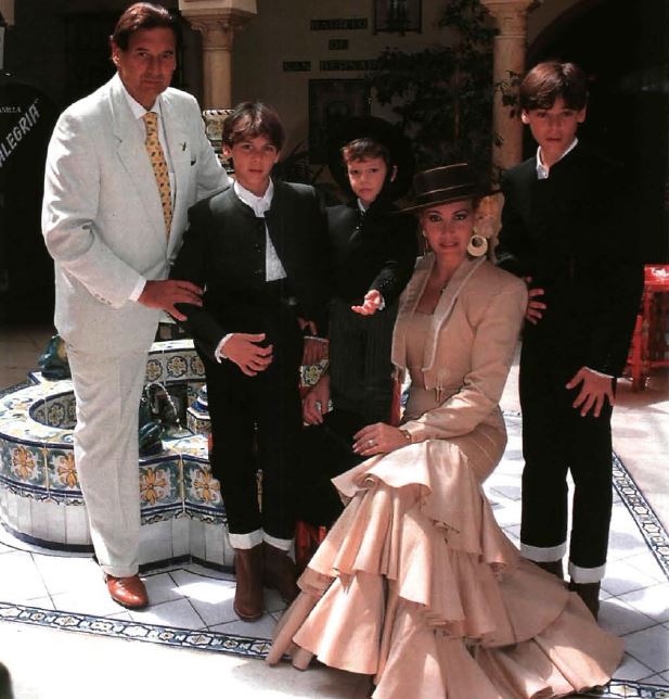 Con este traje mezcla del de flamenca y del corto masculino, Norma Duval visitaba la Feria en 1998. Los niños de corto y Marc Ostarcevic de deportista retirado.
