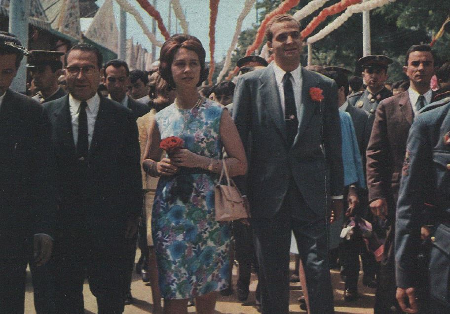 Juan Carlos y Sofía han visitado la Feria en distintas ocasiones. Aquí les vemos en 1968 junto al alcalde de Sevilla.