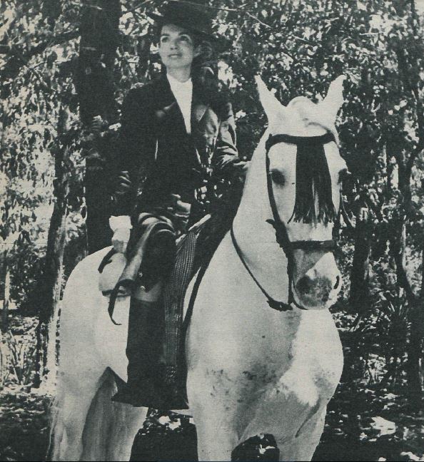 Imponente estampa de Jackeline Bouvier, ya viuda de Kennedy y todavía a un par de años de convertirse en la señora Onassis. Los cánones mandan que una señora que va a montar "a la vaquera" vista el traje corto masculino.