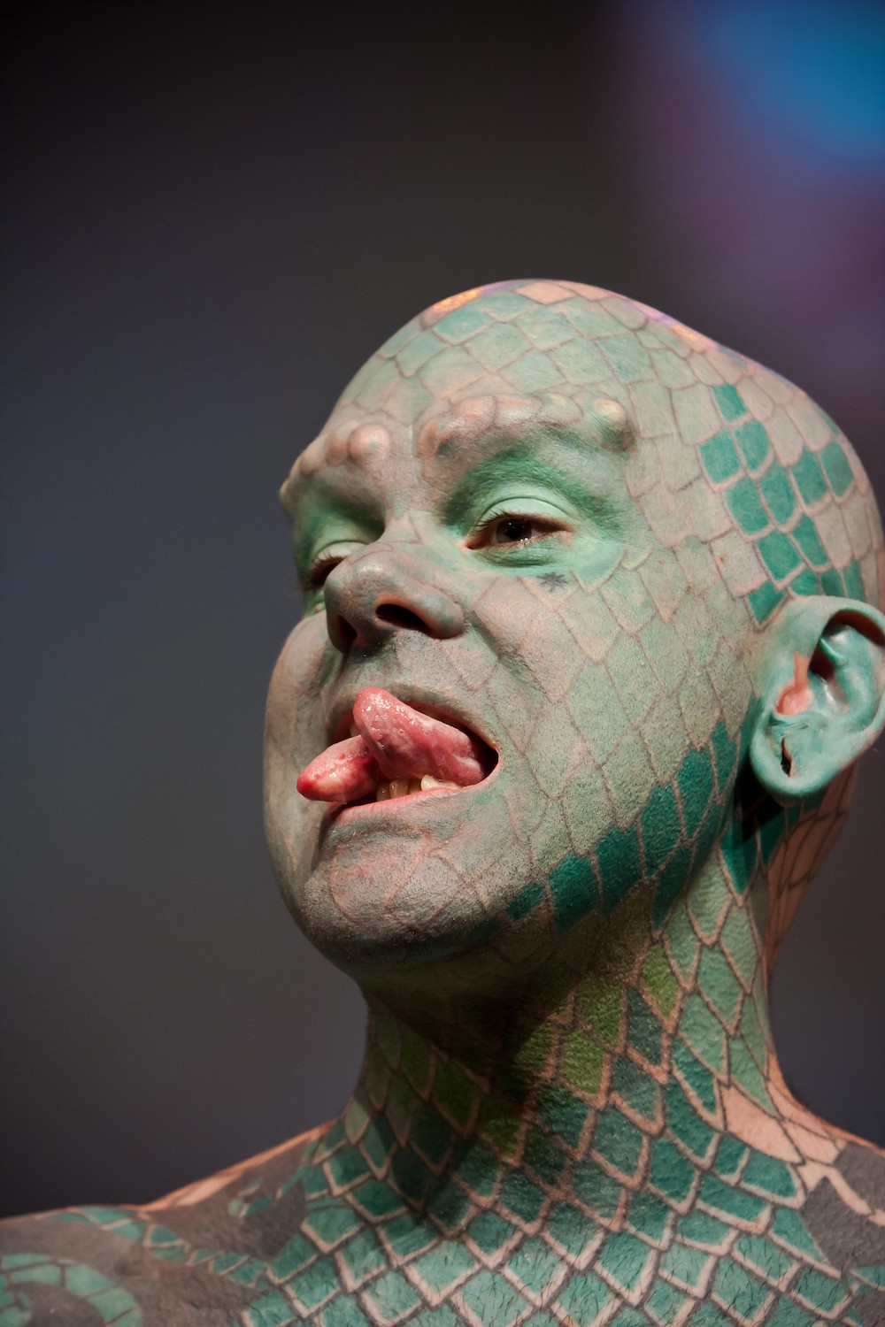 Erik Sprague tatuó toda su piel de verde y con motivos de escamas. También se ha hecho implantes subcutáneos en el contorno de los ojos, se ha afilado los dientes y se ha bifurcado la lengua