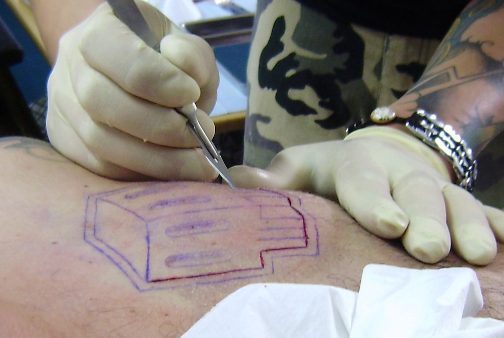 Los tatuajes por escarificación o tatuajes por quemaduras, son una técnica extrema de adorno corporal que consiste literalmente en abrasar o desollar la piel con motivos artísticos de modo que las cicatrices que quedan tras la herida componen los dibujos o motivos escogidos por el cliente. Muchos de los que se someten a esta técnica tan extrema y dolorosa aseguran que duele mucho pero "el placer es mayor". Las marcas son de por vida
