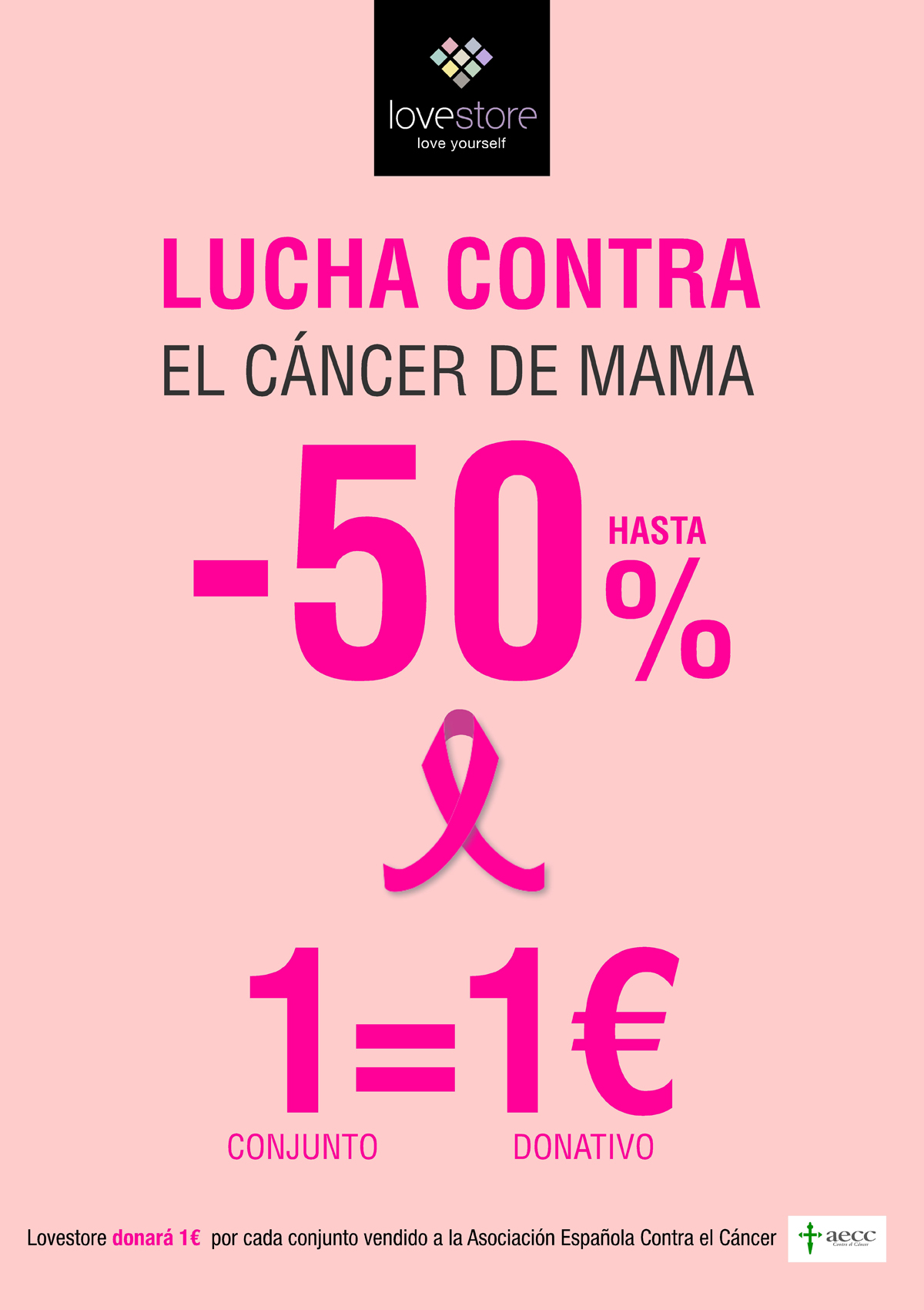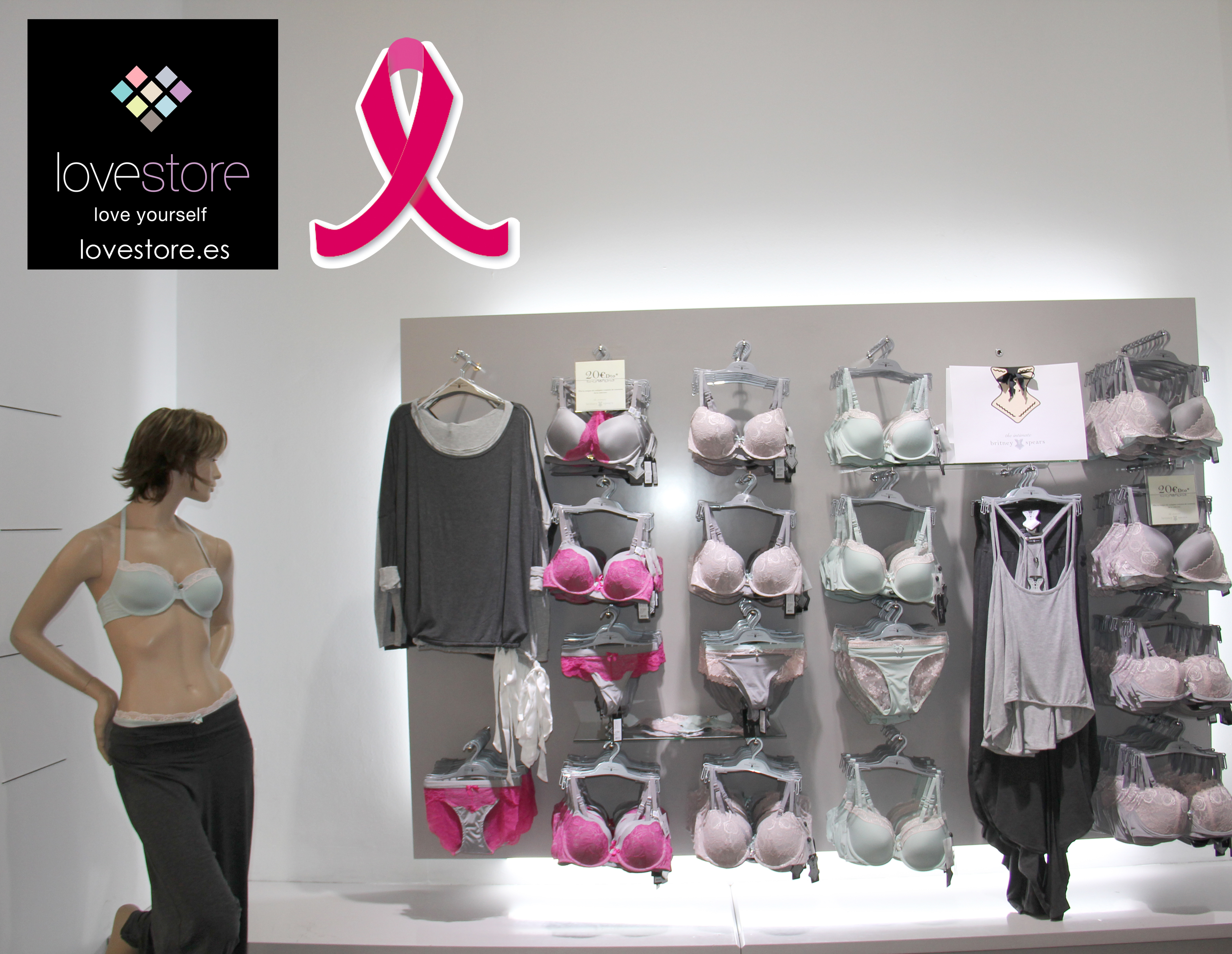 Lovestore.es colabora desde hace años con la Asociación Española contra el Cáncer con la finalidad de ayudar económicamente a combatir el cáncer de mama, una enfermedad que afecta cada año a unas 22.000 mujeres en España. La firma tendrá descuentos especiales de hasta el 50% en todas sus colecciones del 16 al 22 de octubre con motivo del día internacional de cáncer de mama. Por la compra de un conjunto de lencería, lovestore.es donará 1€ a la Asociación Española Contra el Cáncer.